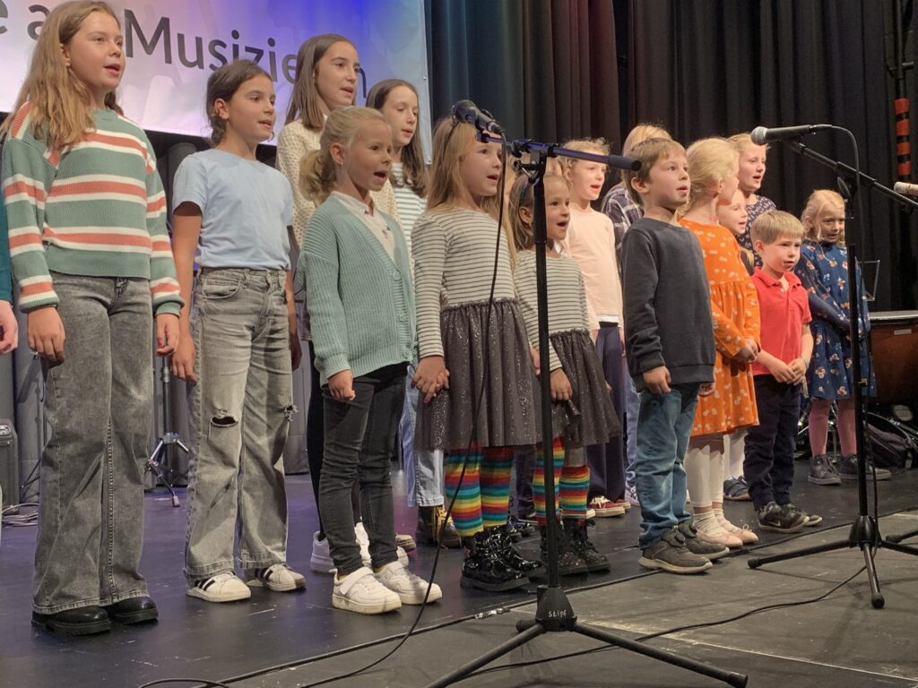 Ein zwanzig Kinder starker Chor (Bild) von Elena Becker-Schramm und Salome Hänsler eröffnete den Abend auf heitere Weise mit Tanz und Gesang aus dem Dschungelbuch mit dem gemütlichen Bären Balu und mit Hey Pippi Langstrumpf.