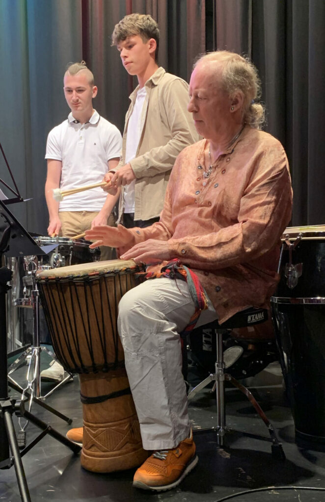 Der nächste Beitrag war ein absolut spannendes Experiment, das man wohl nicht alle Tage erleben kann. Gleich drei Klassen hatten gemeinsam einen Auftritt, Ensembles aus Streichern und Percussions. Die Violinenklasse von Salome Hänsler bot acht Geiger auf, nämlich Magdalene Mast, Elisa Schumacher, Carolin Winkel, Andrea Kösler, Mario Pfob (!), Rebekka Bareiß, Julia Brändle und die Lehrerin selbst, Christoph Theinerts Celloschüler Christina Juanes und Oskar Brauchle und Jeremias Friedrich am Kontrabass und schließlich Ralle Frickers Percussionschüler Tim Schaz (Marimba), Jonas Frickel (Triangel und Becken), Hannes Schlayer (Bass Drum), Pascal Rebmann (Caxixi) und Ralle Fricker (Djembe). Das ungewöhnliche Ensemble spielte mitreißend den Titel „Baba Yetu“ von Christopher Tin, was verdienten Applaus zur Folge hatte.
