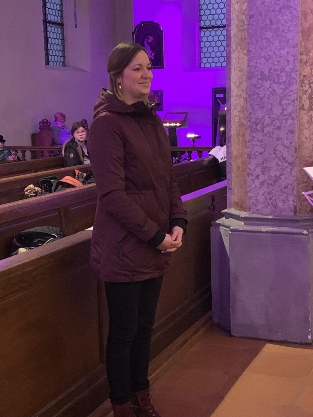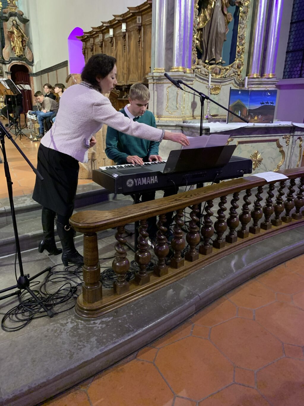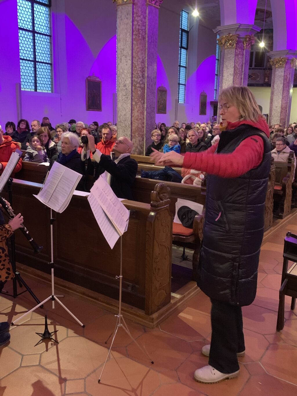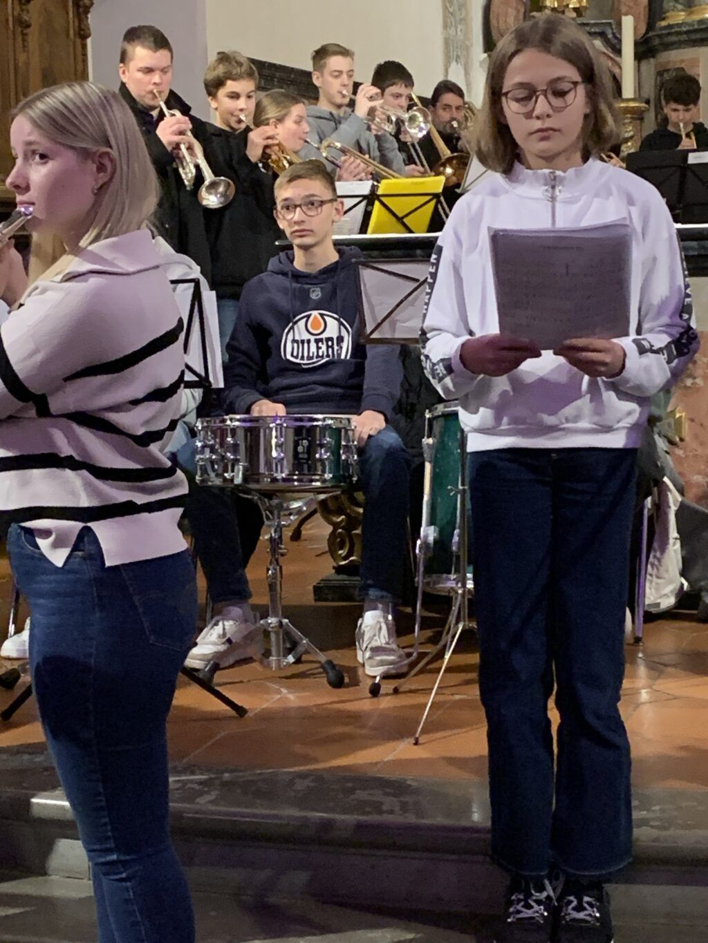 Ein sechzehnköpfiges Blechbläserensemble eröffnete unter der Leitung von Ulrich Triebel das Konzert mit drei Beiträgen. Der erste Titel „Joy to the world“ stimmte hörbar und raumfüllend Freude verkündend auf den dritten Adventsabend ein. Der zweite Beitrag passte – leider – bestens in die derzeit von Kriegen heimgesuchte Welt: „Dona nobis pacem“, ein dreistimmiger Kanon, der oft Eucharistiefeiern begleitet, aber auch fester Bestandteil des kirchlichen Weihnachtsliedgutes ist.