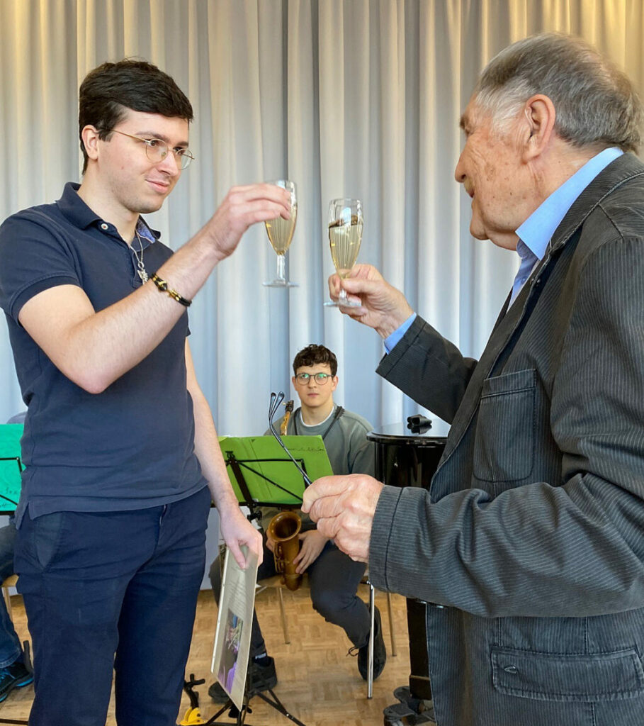 Das Violinen-Ensemble von Lehrerin Salome Hänsler eröffnete das musikalische Programm. Mit sanften Streichklängen konnten sie das Publikum überzeugen (Schüler: Rebekka Bareiß, Sergen Batur, Julia Brändle, Julia Emmendörfer, Magdalene Mast, Mario Pfob, Elisa Schuhmacher). Anschließend begrüßte der im vergangenen Sommer neu gewählte JMS-Vorstand Mario Pfob die zahlreich erschienenen Gäste und bedankte sich bei allen Helfern, die diese Veranstaltung erst möglich gemacht haben. Pfob erzählte vor allem von seinen persönlichen Erlebnissen mit Herrn Lutz, der ihn während seiner eigenen musikalischen Entwicklung stets begleitet und ermutigt hat. „Peter, Du bist das perfekte Beispiel dafür, dass Musik dem Körper guttut“, sagte Mario Pfob und gab seiner Hoffnung Ausdruck, dereinst mit 80 Jahren geistig und körperlich so fit zu sein wie Peter Lutz.