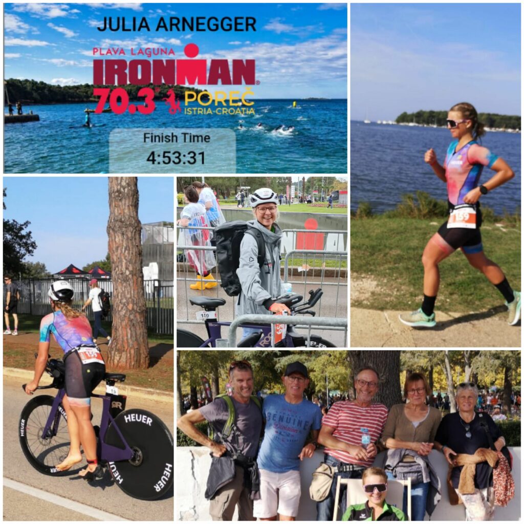 Porec ist eine kleine Hafenstadt auf der Halbinsel Istrien, für Normalos ein beliebter Badeort zum Abhängen. Nicht für Julia Arnegger, die direkt beim Startsprung ins Adriatische Meer ihre Topform unter Beweis stellte und in kräftigen Kraulzügen das 1,9 km lange türkisblaue Feld beherrschte. Aus dem Wasser im Sprint direkt aufs Rad startete sie mit vollem Druck in die Pedale. Sie erreichte eine Geschwindigkeit von 35,6 km/h im Durchschnitt auf die 90 Kilometer, wer will da mithalten?