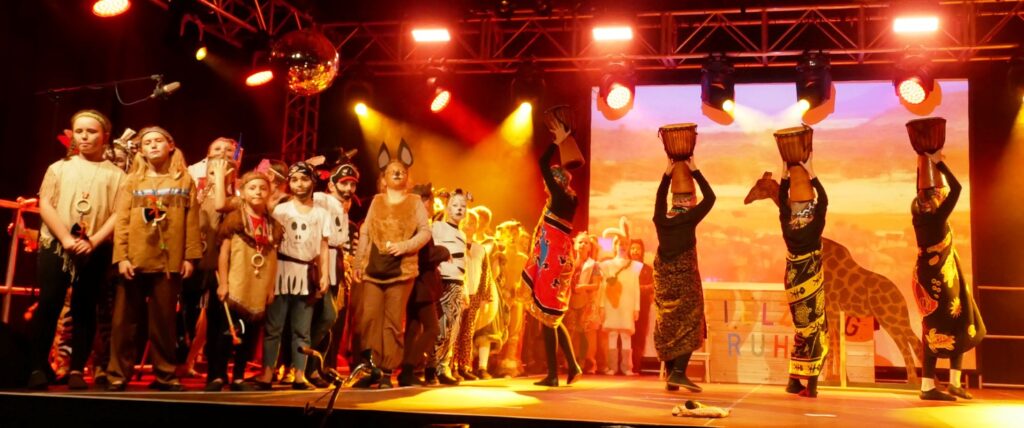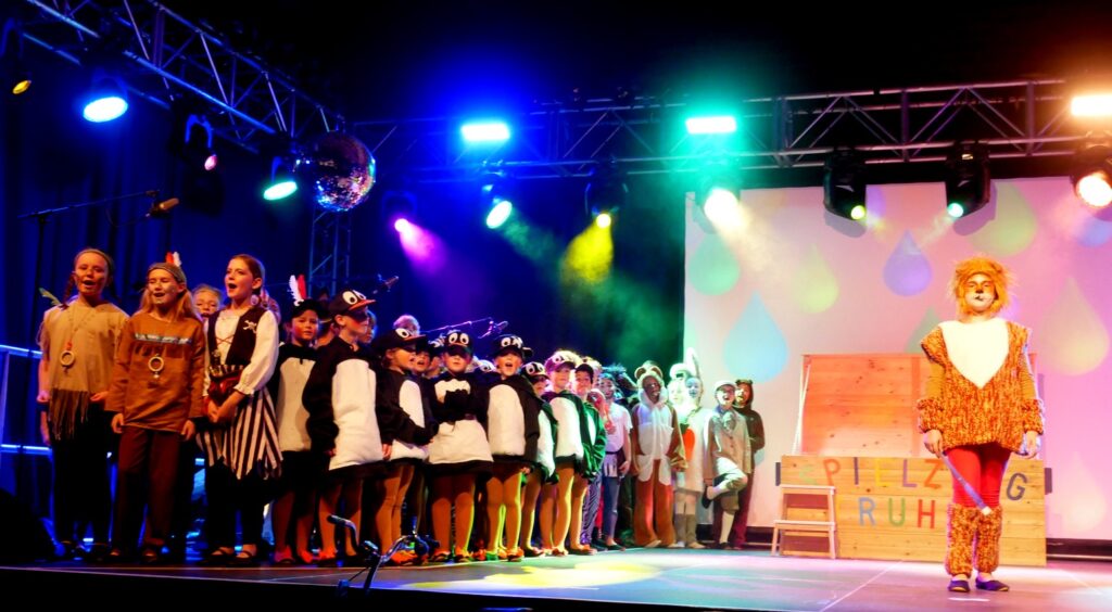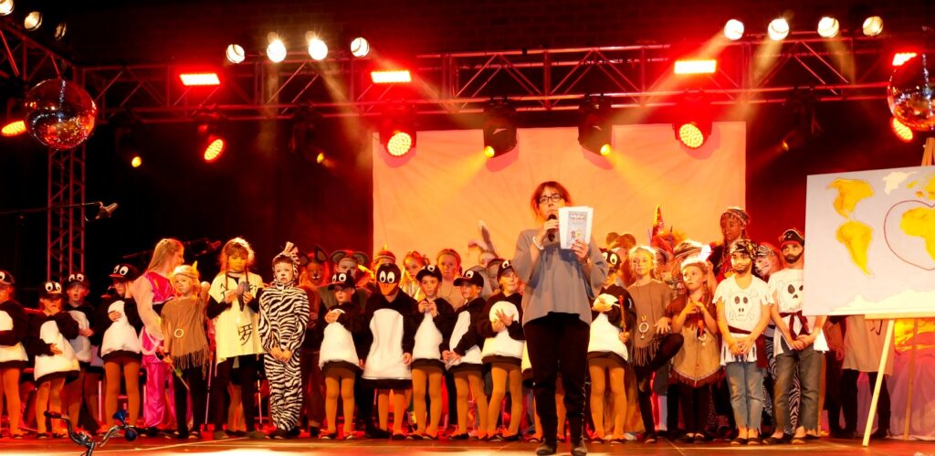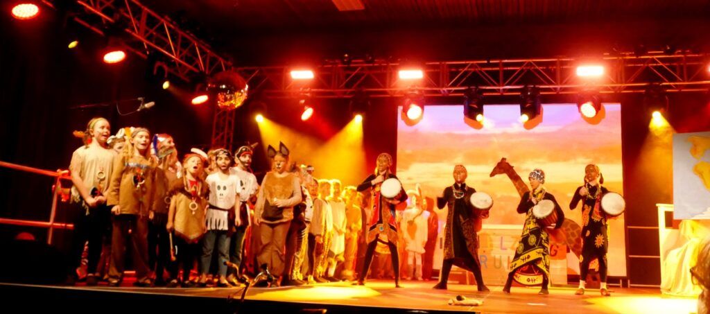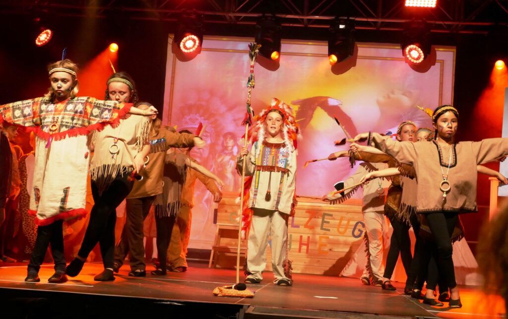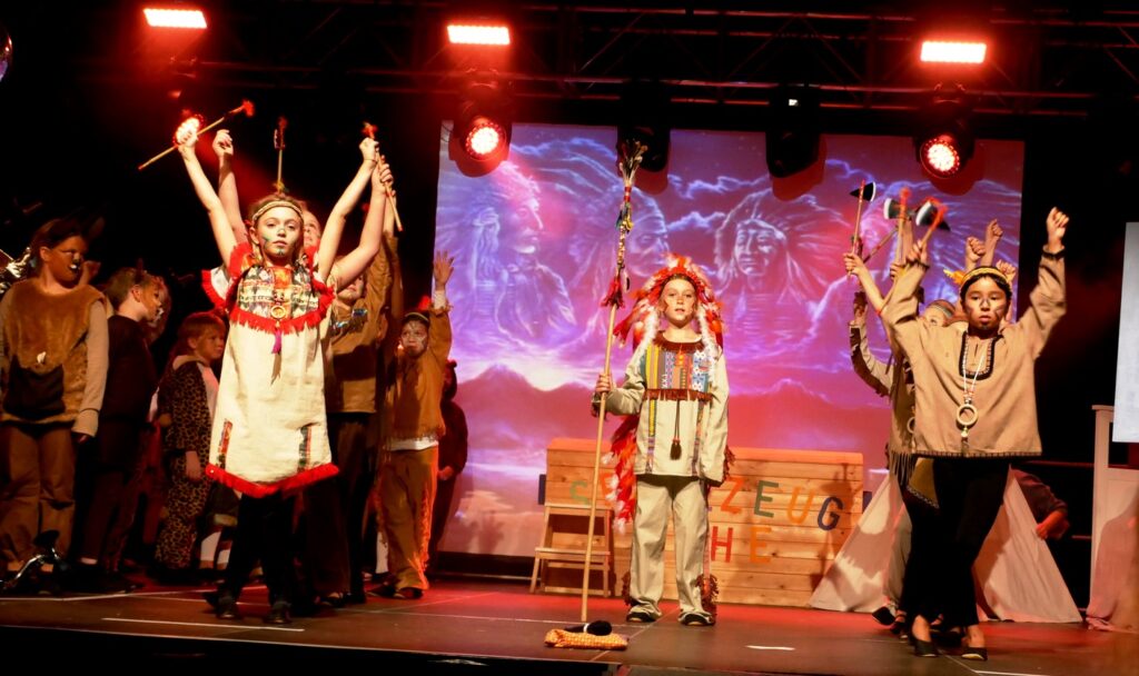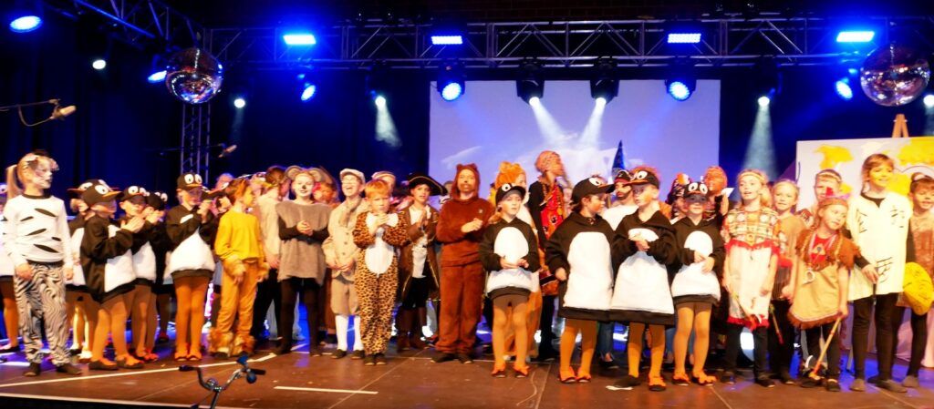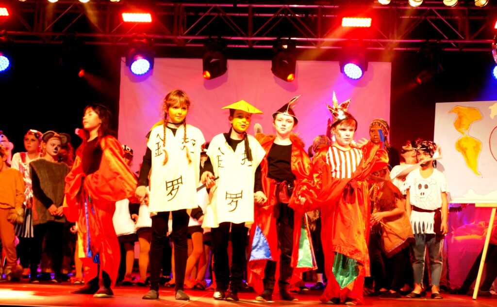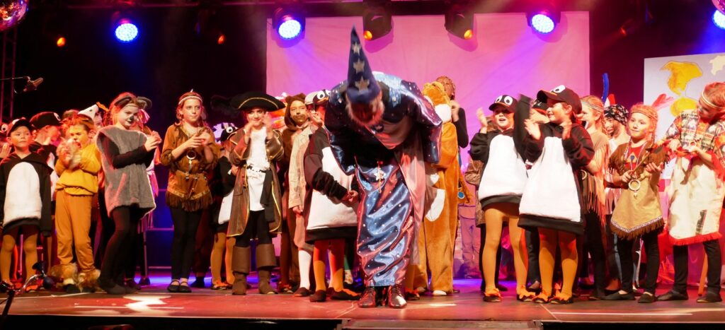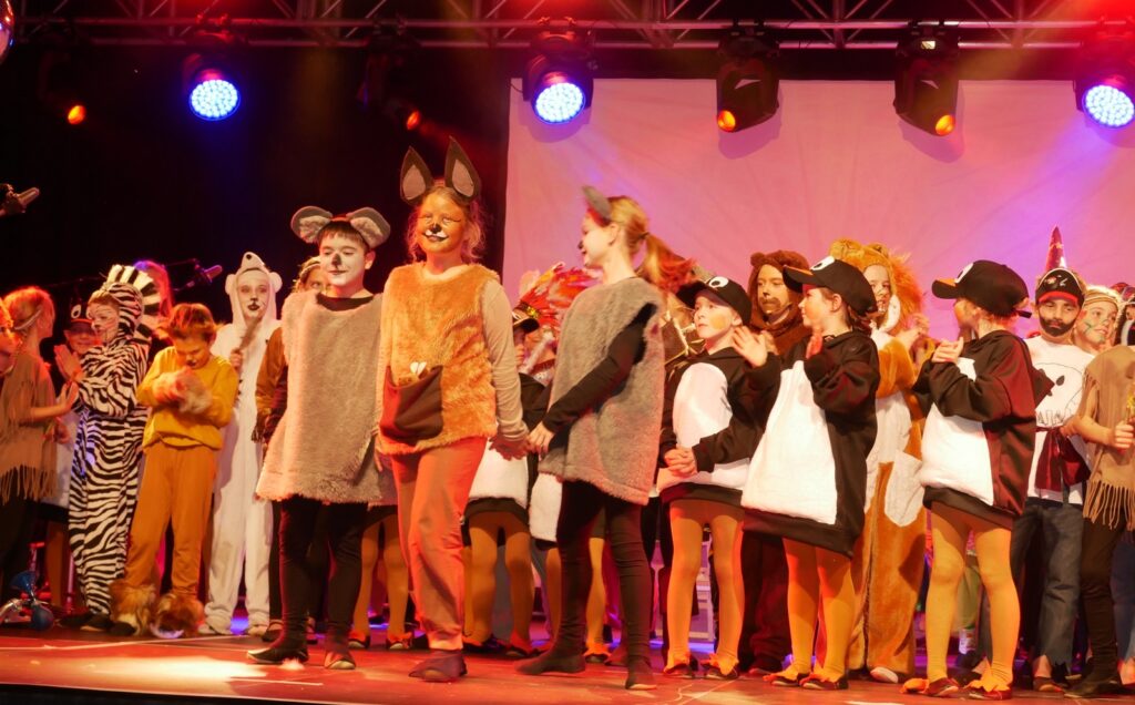 Alle Kinder der Klassenstufe 1-4 und dazu auch Schülerinnen und Schüler, die jetzt 5. Klassen anderer Schularten besuchen, gehörten zu den Akteuren auf der Bühne. Die monatelangen Proben im vergangenen Schuljahr unter der Regie von Schulleiterin Angelika Zimmermann haben sich gelohnt, denn all die hervorragend gespielten Szenen, die Tänze und Lieder der jungen Akteure haben ihre Wirkung auf das Publikum (insgesamt etwa 700 Besucherinnen und Besucher) nicht verfehlt.
