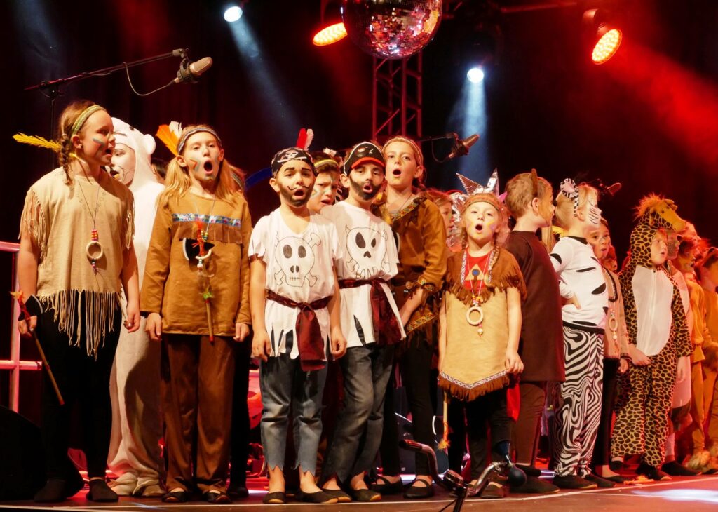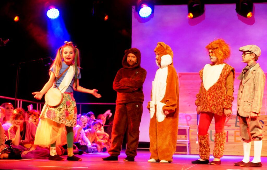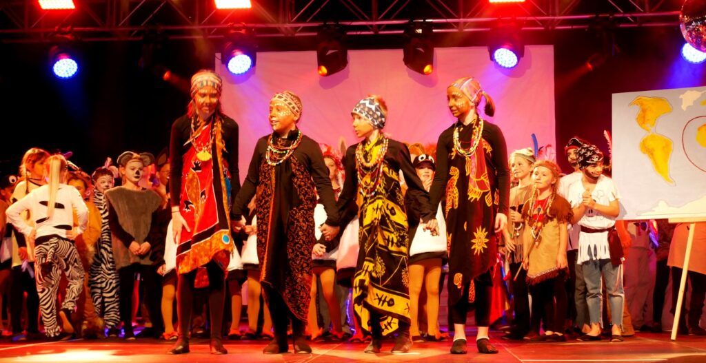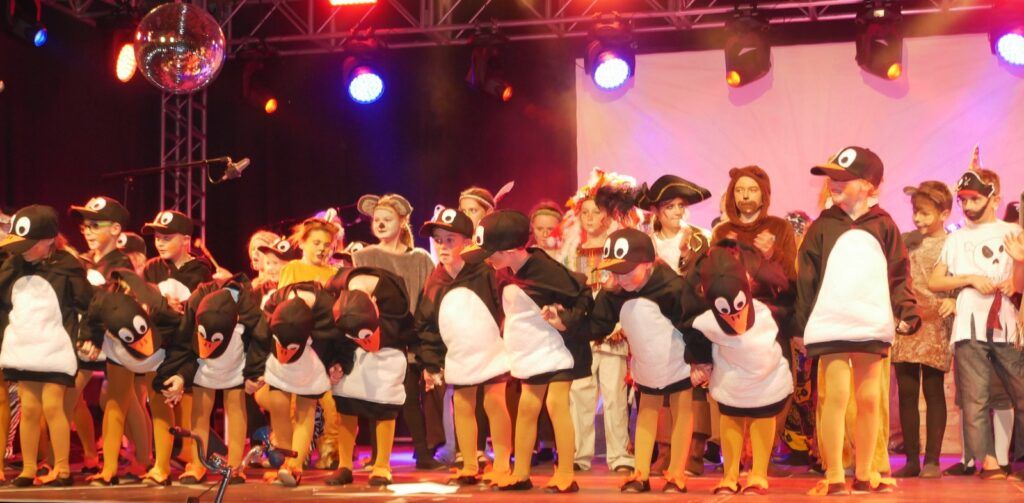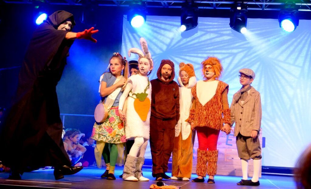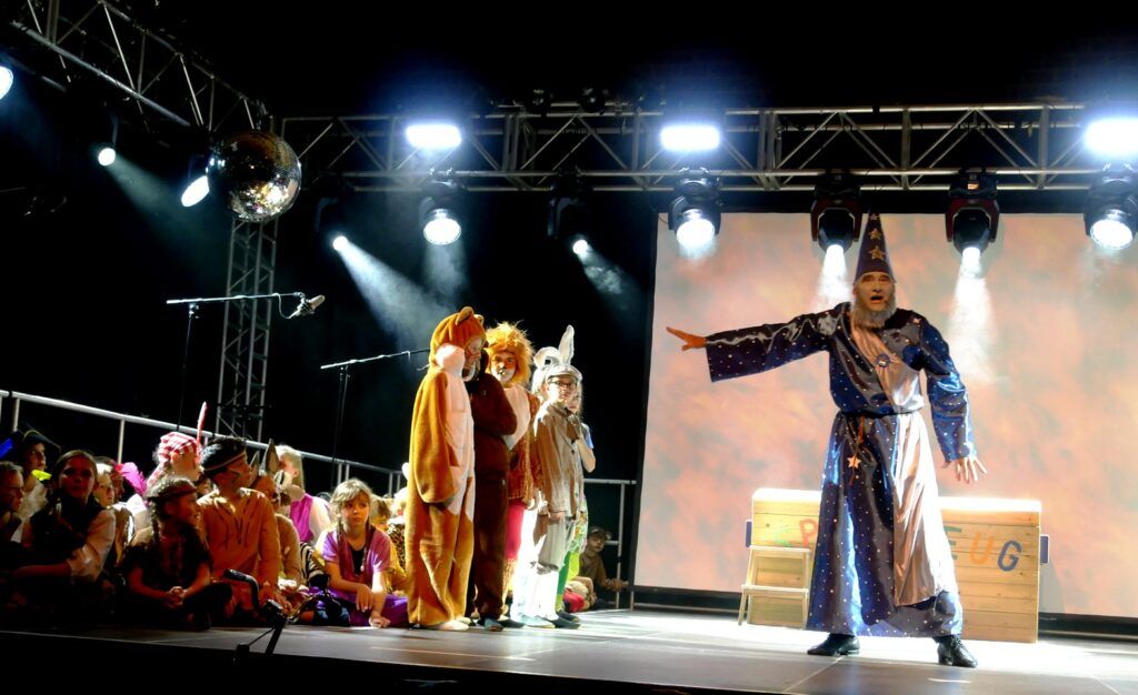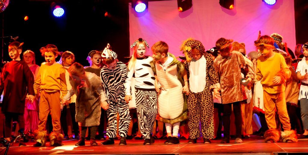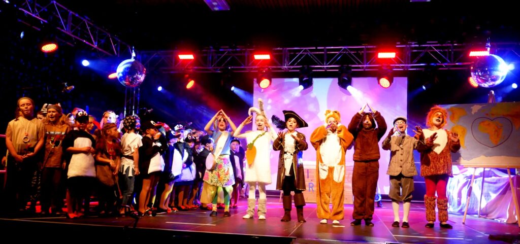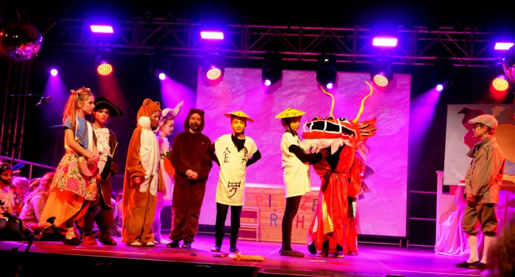 Alle Kinder der Klassenstufe 1-4 und dazu auch Schülerinnen und Schüler, die jetzt 5. Klassen anderer Schularten besuchen, gehörten zu den Akteuren auf der Bühne. Die monatelangen Proben im vergangenen Schuljahr unter der Regie von Schulleiterin Angelika Zimmermann haben sich gelohnt, denn all die hervorragend gespielten Szenen, die Tänze und Lieder der jungen Akteure haben ihre Wirkung auf das Publikum (insgesamt etwa 700 Besucherinnen und Besucher) nicht verfehlt.
