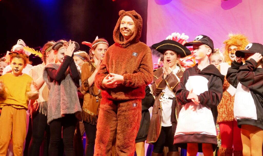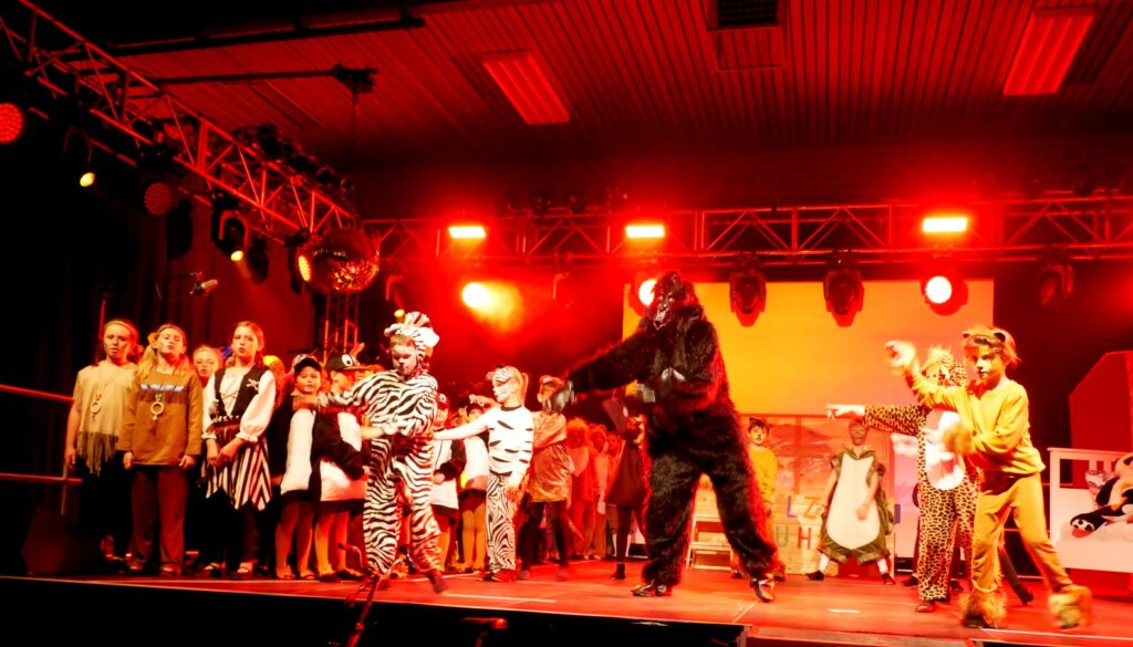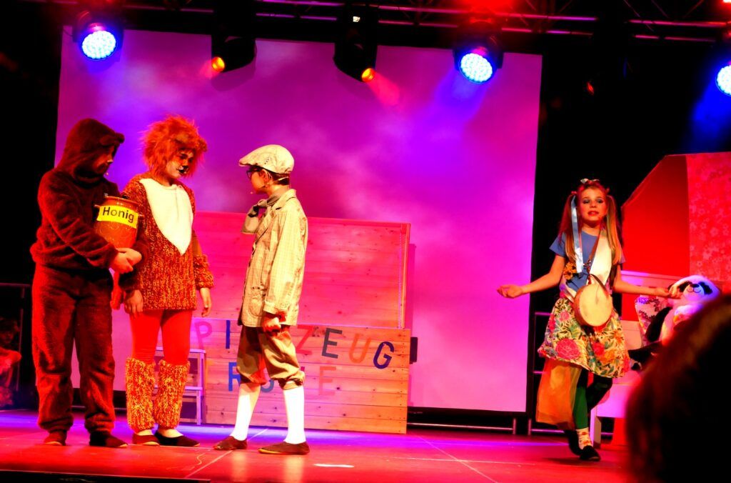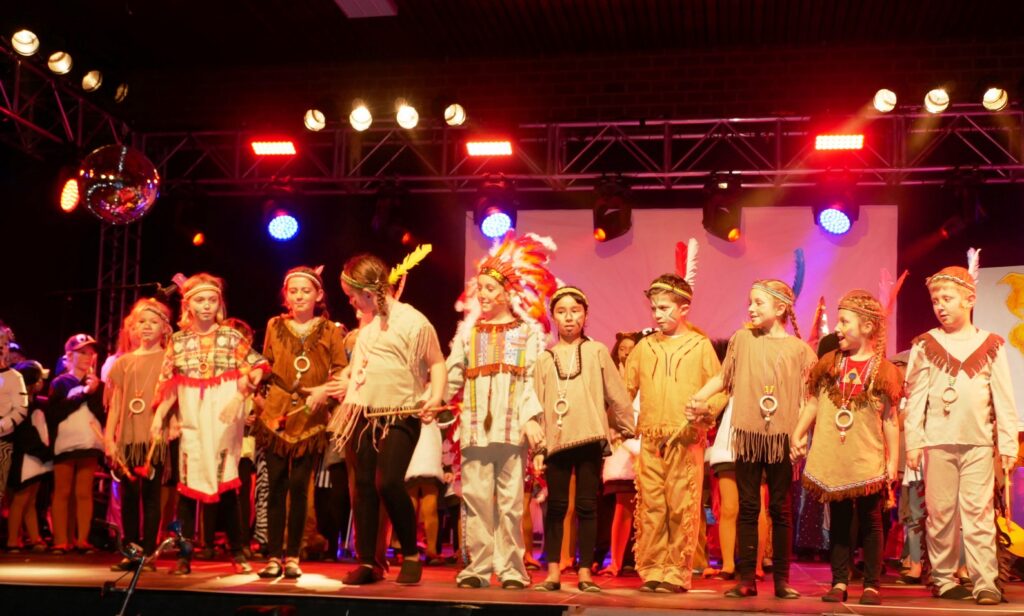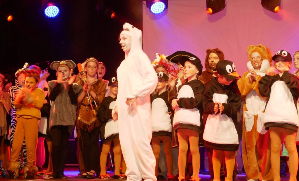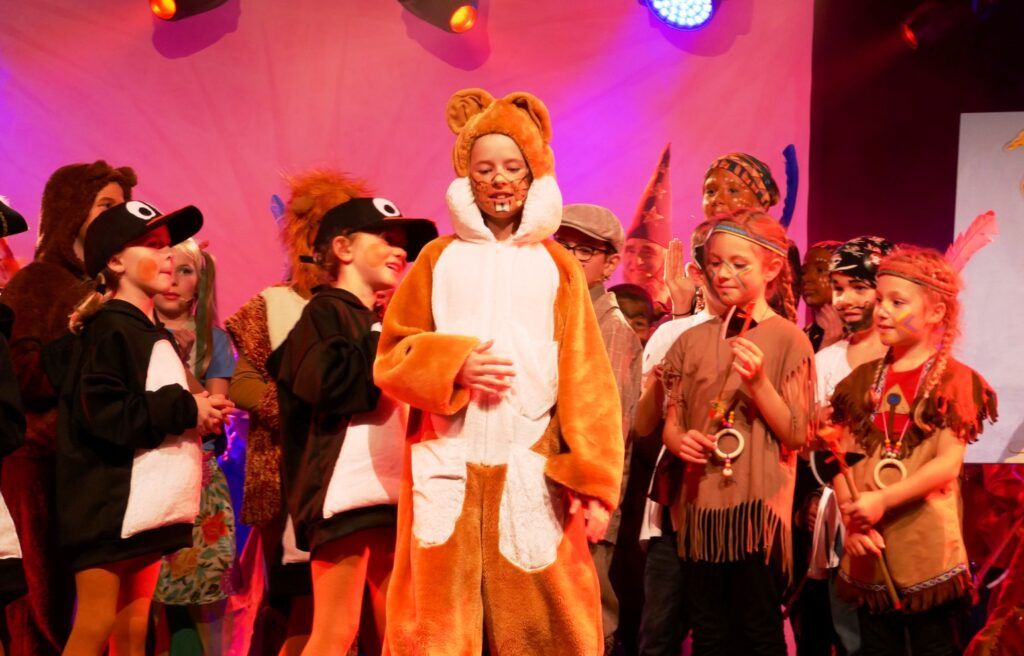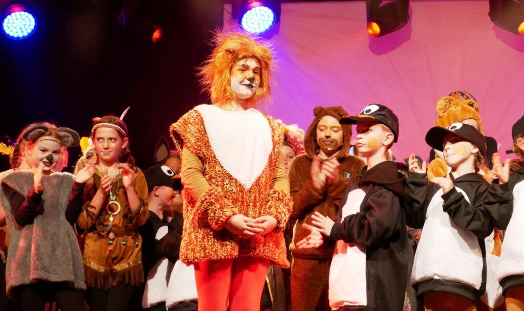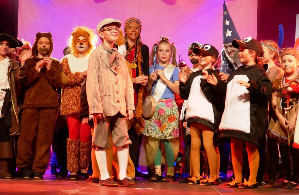Alle Kinder der Klassenstufe 1-4 und dazu auch Schülerinnen und Schüler, die jetzt 5. Klassen anderer Schularten besuchen, gehörten zu den Akteuren auf der Bühne. Die monatelangen Proben im vergangenen Schuljahr unter der Regie von Schulleiterin Angelika Zimmermann haben sich gelohnt, denn all die hervorragend gespielten Szenen, die Tänze und Lieder der jungen Akteure haben ihre Wirkung auf das Publikum (insgesamt etwa 700 Besucherinnen und Besucher) nicht verfehlt.