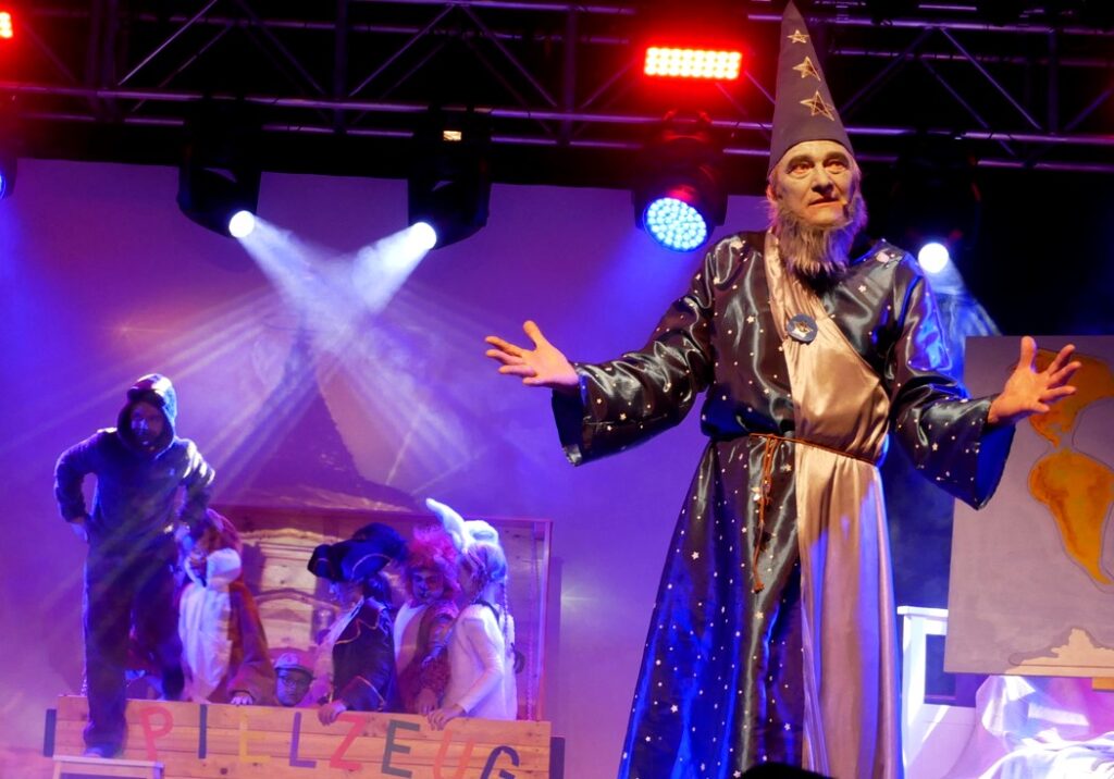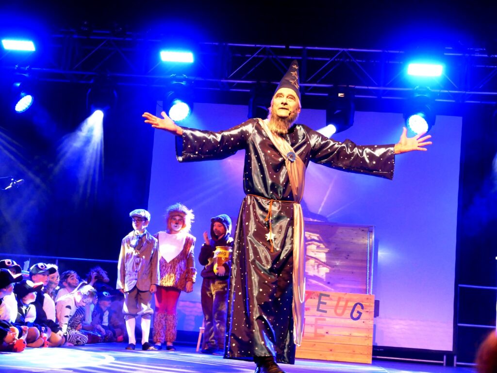 Begrüßt wurde die Gästeschar jeweils von Mathias Konrad, dem Vorsitzenden des Fördervereins des Kindergartens St. Margret und der Grundschule Haisterkirch. Als Gastspieler konnte Hans Ehinger vom Kulturverein Spektrum K Bad Waldsee erneut für die so tief beeindruckenden Rollen als Zauberer und Darsteller des „Hasses“ gewonnen werden. Die Namen all der mitwirkenden Kinder in den verschiedensten Rollen, alle wunderbar passend kostümiert, sind übrigens in den ausgelegten Flyern genannt, wie auch die Sponsoren dieser Veranstaltung.
