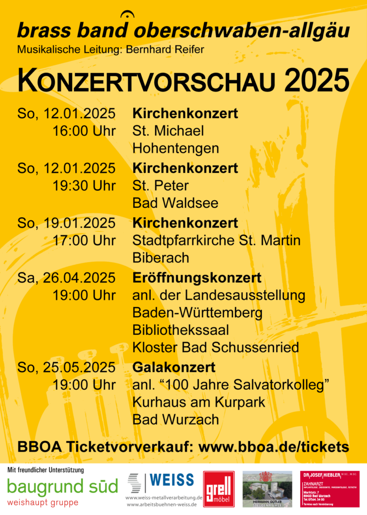 Erleben sie die Brassband Oberschwaben-Allgäu unter der Leitung des Dirigenten Bernhard Reifer. Ein unbeschreibliches Klangerlebnis, das man sich nicht entgehen lassen sollte. Konzertbeginn ist um 19.30 Uhr, Eintrittskarten gibt es an der Abendkasse.