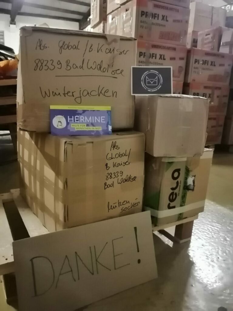 Seit einigen Jahren sind wir, Global und Hermine e. V., in guter Zusammenarbeit verbunden. Von Würzburg startet der Hilfskonvoi; vor Ort werden die Hilfsgüter von den Helfer/innen verteilt. Die Menschen sind dort ohne Schutz und sonstige Versorgung. Mittlerweile sind ehrenamtlich Ärzte dabei, die sich um die dringlichste Versorgung kümmern.