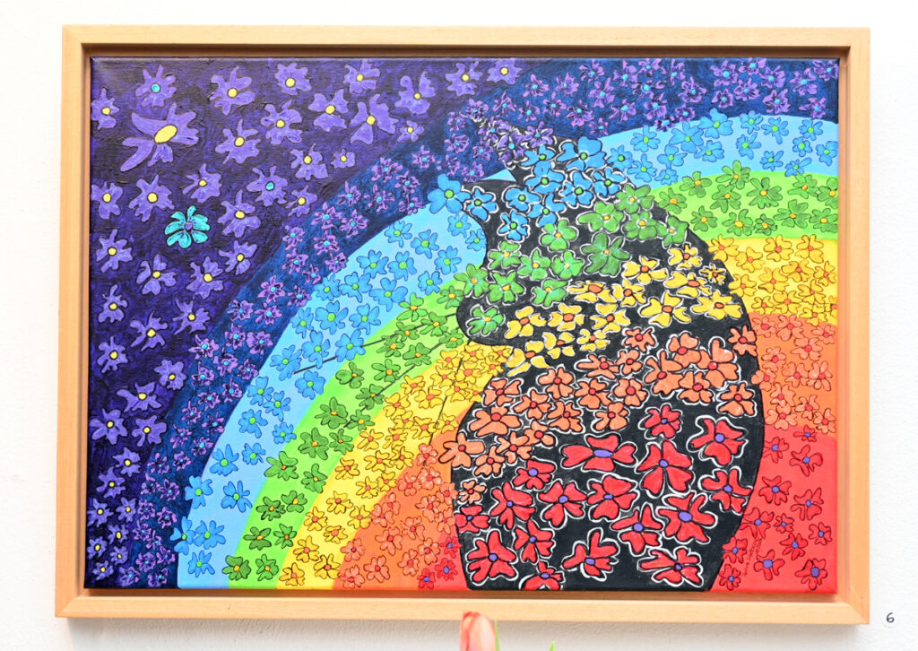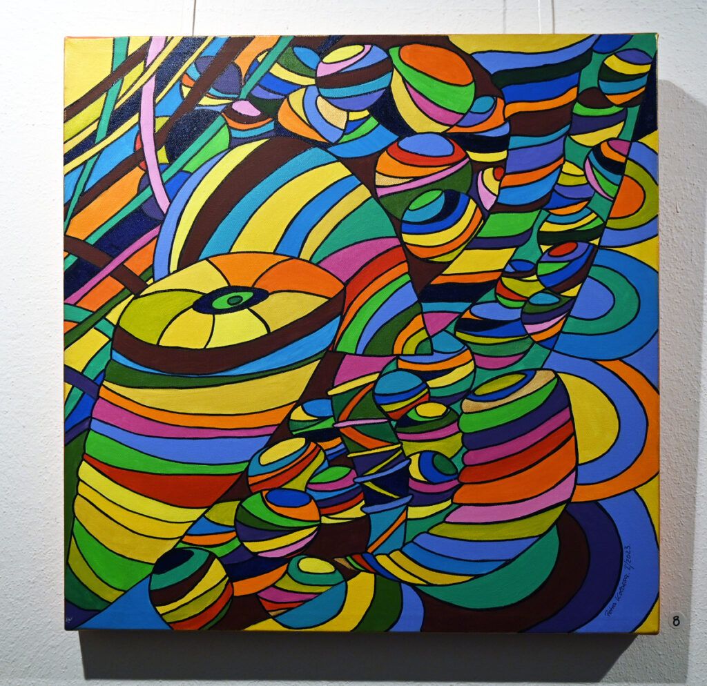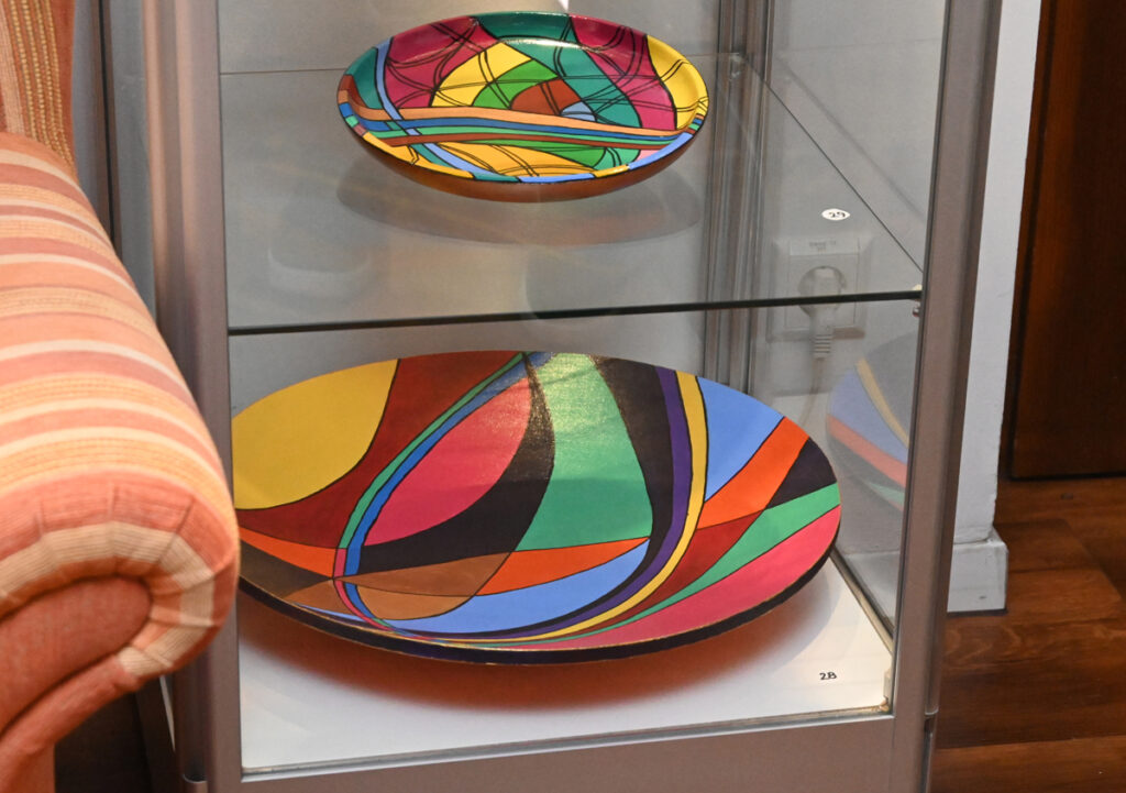 In der Ausstellung gibt es zwei- und auch dreidimensionale Bilder zu sehen. Ihre bunten Malereien findet man aber auch in der Serie „homepART“ wieder. Das sind bunt bemalte Schalen, Teller und Tabletts, die für den häuslichen Gebrauch geschaffen wurden.