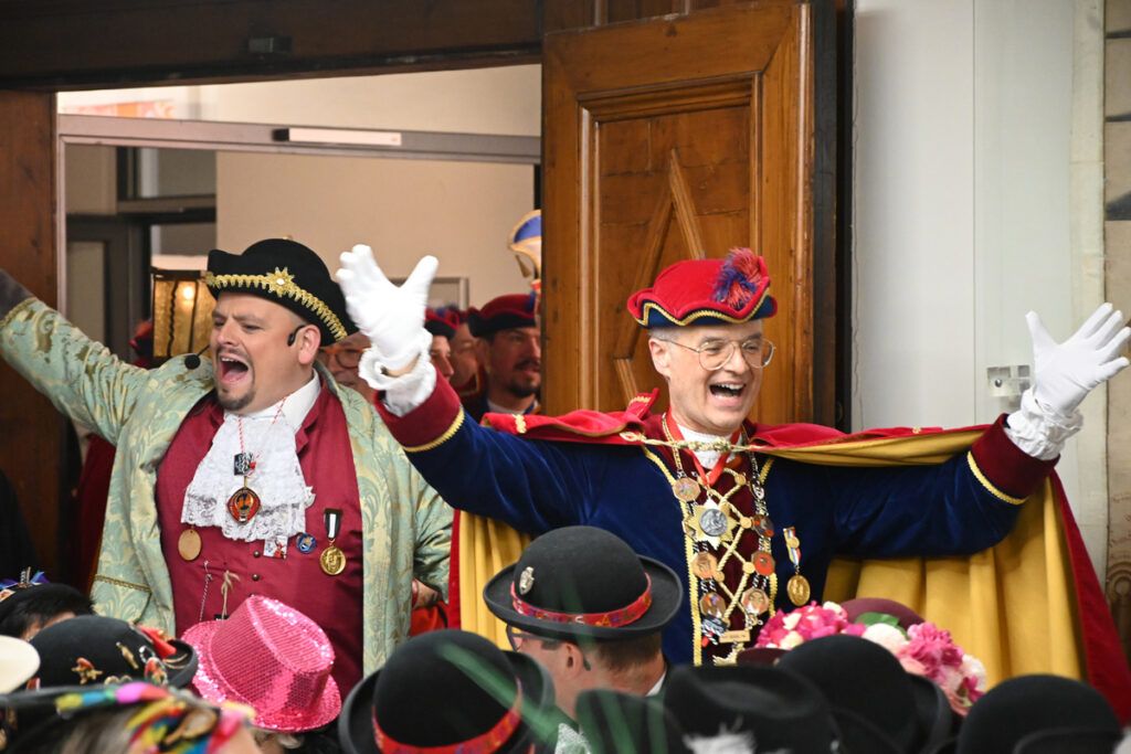 Die Gemeinderäte mit würdigen schwarzen Talaren und weißen Perücken, der OB mit schwarzem Gehrock und seinem flotten Barett mit keckem Federschmuck kamen zur Sitzung im alten Ratssaal. Die Sitzung ging hin und her, Tagesordnungspunkt: Übergabe der Macht an die Narren. Ein Für und Wider, bis der Herold des Zunftrates auftrat. Er verlas die Proklamation des Zunftrates, der die sofortige Übergabe von Narrenrecht und Narrenfreiheit verlangte. Der Rat zierte sich nicht lange, die Freiheiten vom Mittwochabend dieser Woche bis Dienstagabend der nächsten wurden gewährt, verbrieft und gesiegelt.