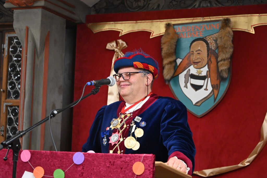 Zunftmeister Christoph Mayer begrüßte als „neuer starker Mann“ alle Ehrengäste beim Narrenrechtabholen. Stellvertretend für die Waldseer Firmen SaluVet, Thüga, das Hymer-Familiy Office, und Nold-Hydraulik. Und ganz besonders herzlich Gerda Hymer.