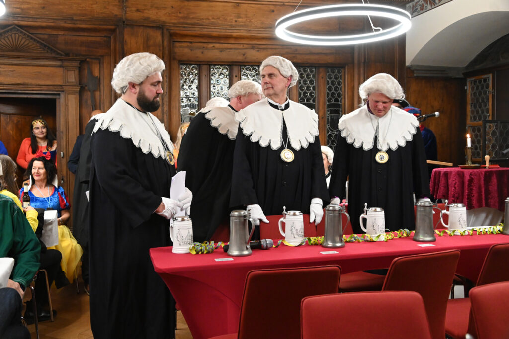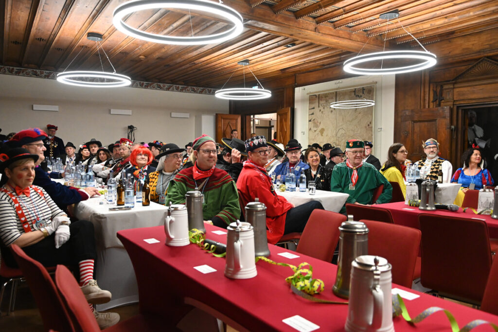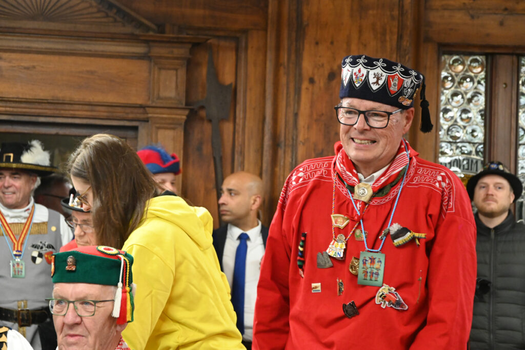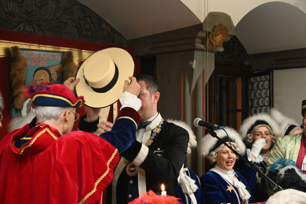 Der Zunftrat betrat mit viel AHA, Fahne, Faselhannes, Hofmarschall und seiner Garde den Sitzungssaal. Er verlangte das Narrenrecht mit Brief und Siegel, hängte dem OB die närrische Amtskette um und zierte ihn mit dem Strohhut.