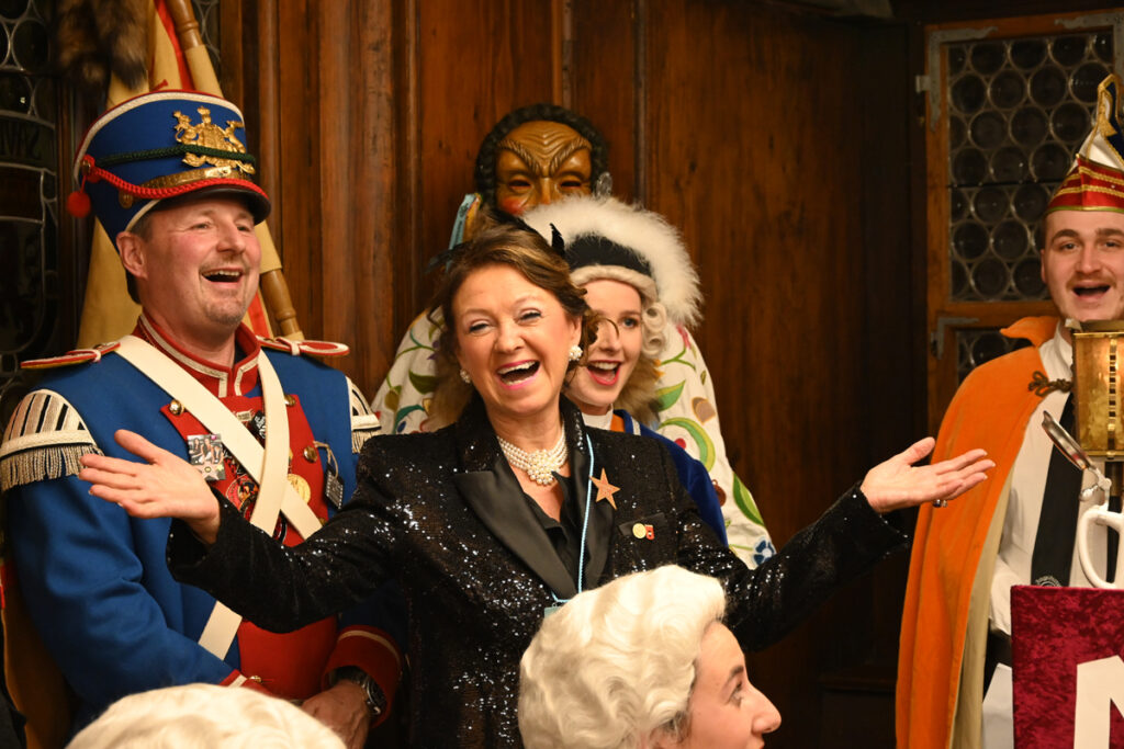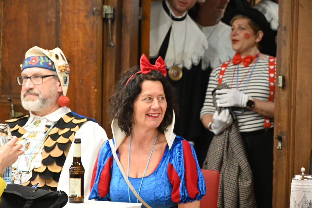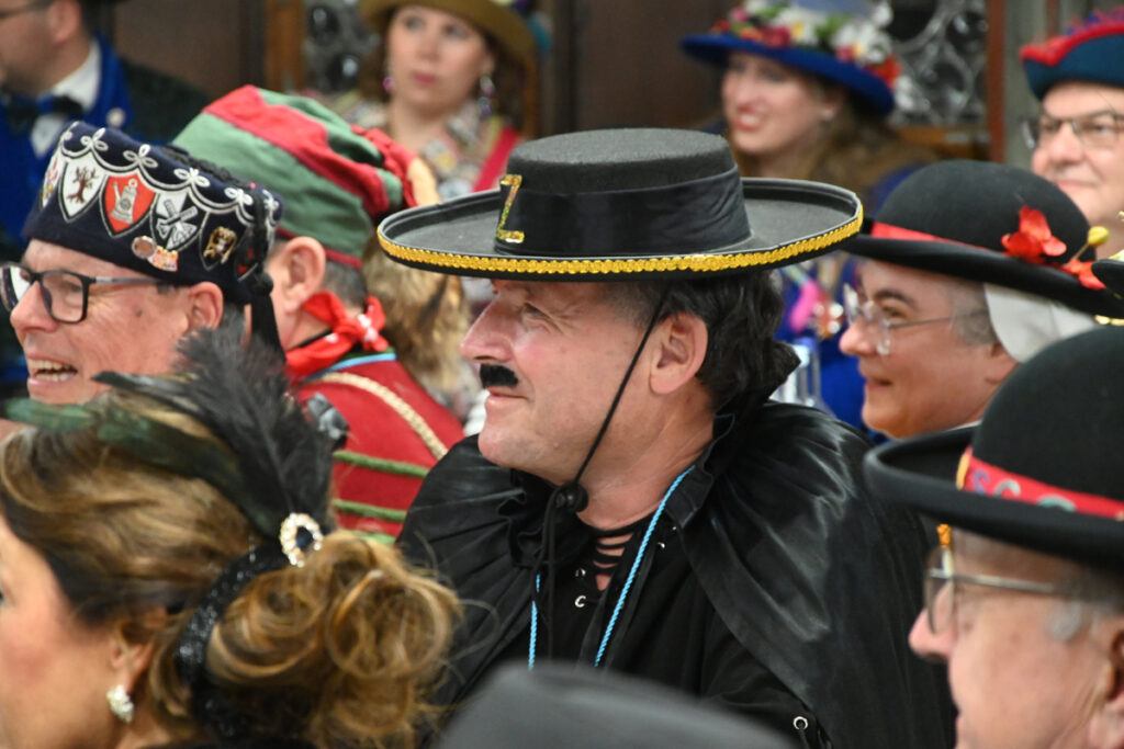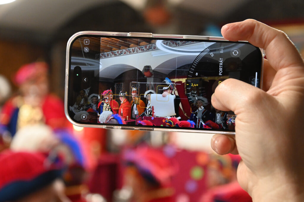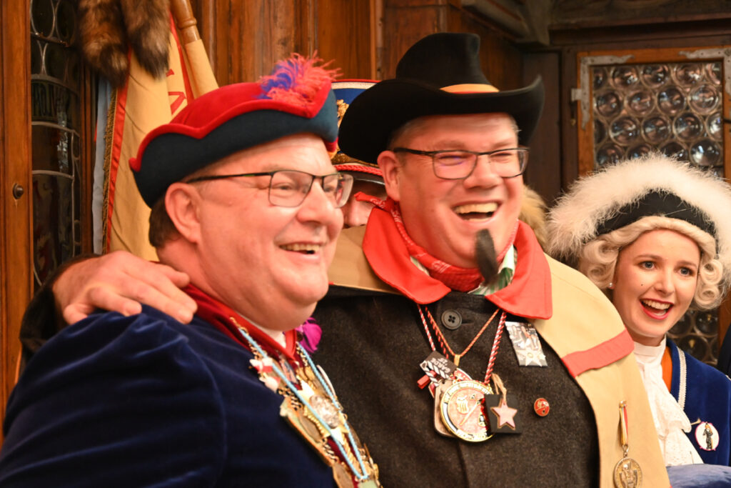 Der Zunftrat betrat mit viel AHA, Fahne, Faselhannes, Hofmarschall und seiner Garde den Sitzungssaal. Er verlangte das Narrenrecht mit Brief und Siegel, hängte dem OB die närrische Amtskette um und zierte ihn mit dem Strohhut.