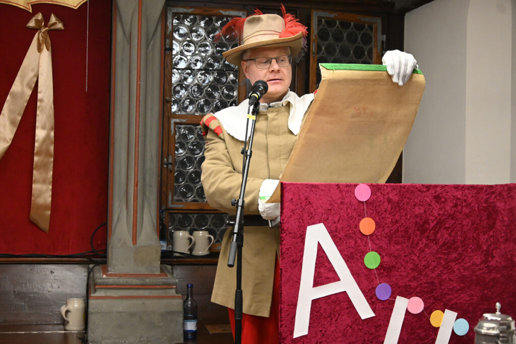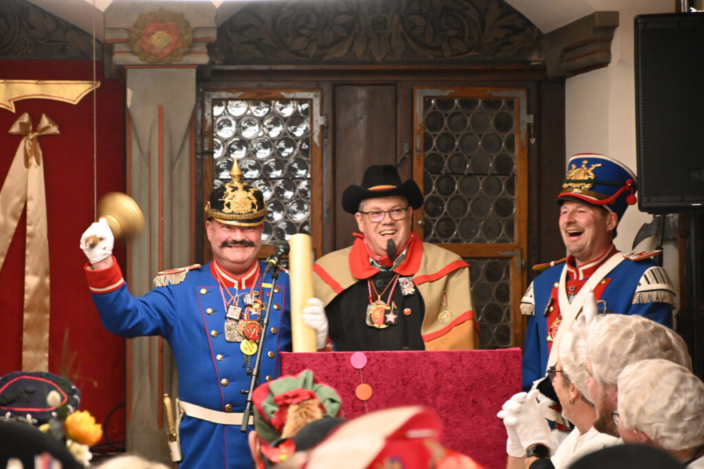 Ordenskanzler Elmi Kibler eröffnete das Narrenrechtabholen und erklärte den Ablauf in drei Akten. Erster Akt: Der Kurier kommt. Zweiter Akt: Die Nachtwächtergruppe erscheint. Dritter Akt: Der Zunftmeister und sein Rat übernehmen die Macht.