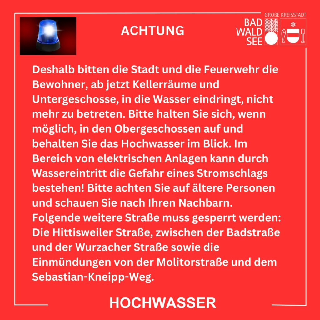 Das Wasser kann sehr schnell und unkontrolliert in die Gebäude eindringen. Deshalb bitten die Stadt und die Feuerwehr die Bewohner, ab jetzt Kellerräume und Untergeschosse, in die Wasser eindringt, nicht mehr zu betreten. Bitte halten Sie sich, wenn möglich, in den Obergeschossen auf und behalten Sie das Hochwasser im Blick. Im Bereich von elektrischen Anlagen kann durch Wassereintritt die Gefahr eines Stromschlags bestehen!