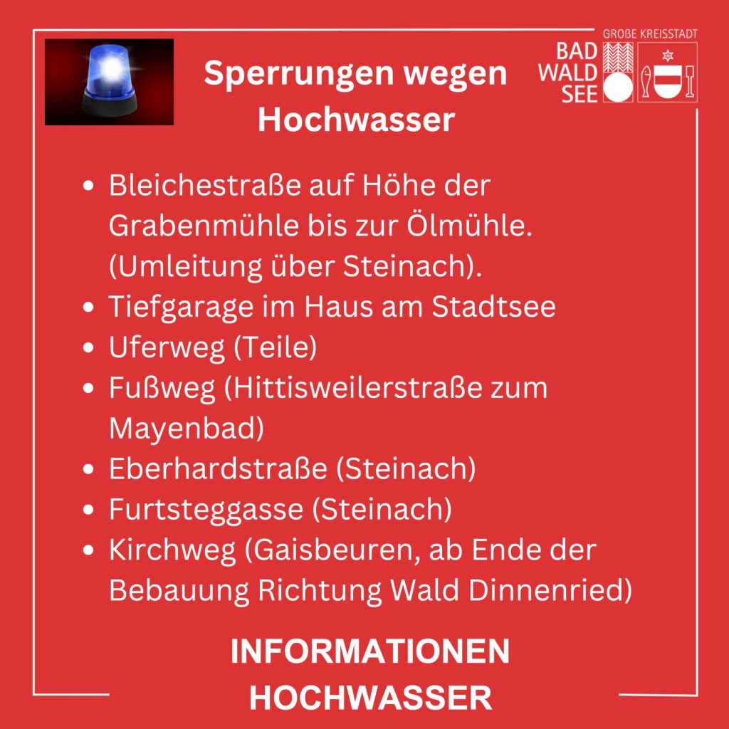 Der städtische Krisenstab, die Feuerwehr Bad Waldsee und der städtische Baubetriebshof treffen sich in kurzen zeitlichen Abständen und ergreifen weiterhin die notwendigen Maßnahmen, um Gefahren für Personen und Sachgüter durch den anhaltenden Regen einzudämmen.