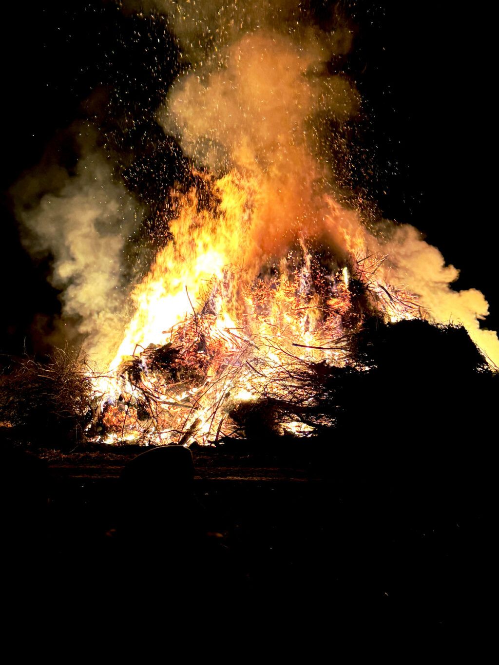 Die Funkenbauer Edmund Gresser, Paul Hepp jr., Julian Hepp, Stefan Storrer und Sebastian Storrer entzündeten gegen 18.15 Uhr das Funkenfeuer. Das fand rasch Nahrung und schon bald stand der ganze Funken in Flammen. Das lodernde Feuer und die senkrecht aufsteigende Rauchsäule mit glühendem Funkenflug sorgten für eine mystische Stimmung.