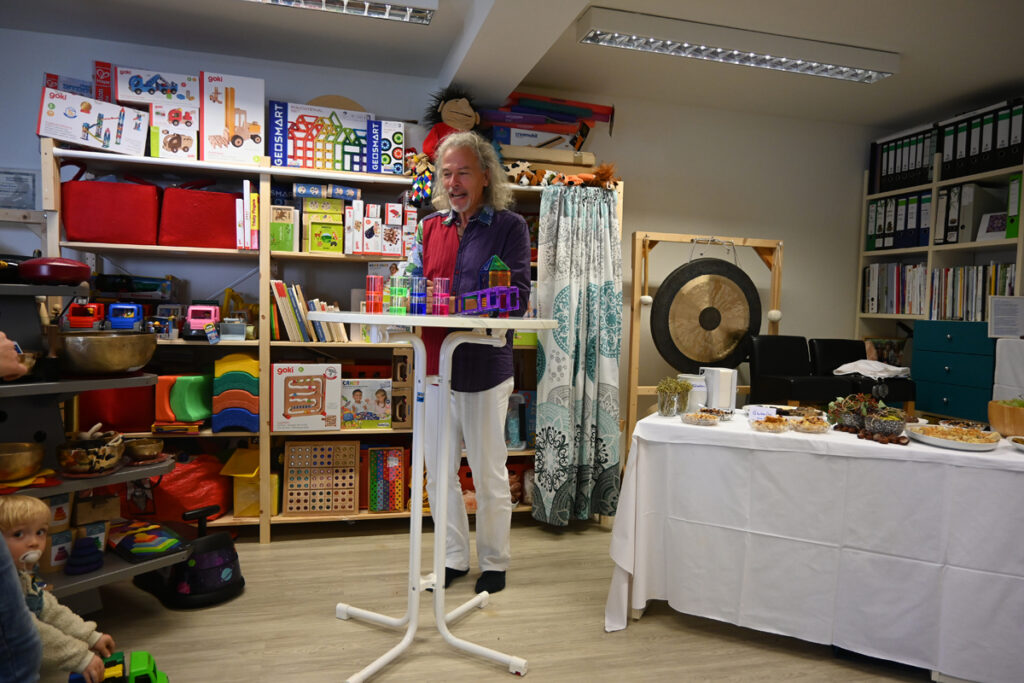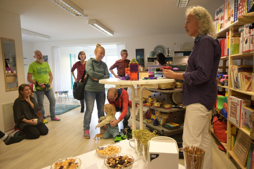 Kindergartenausstattung Ist die Spezialität von Franz Xaver Ott. In den Räumen Muschgaystraße kann ein Teil des umfangreichen pädagogischen Spiel- und Lernmaterials angeschaut und ausprobiert werden. Am Tag der Offenen Tür stellte er magnetische Bastelbaukästen, Holzspielzeug und viele andere Gegenstände vor. „In meiner Wiege lag auch verkäuferisches Talent“, erzählte er bei der Präsentation seines Sortiments. Und PetraMaria ergänzte: „In viele Kindergärten dürfen keine Verkäufer mehr hinein, nur dem FranzXaver öffnen sich noch die Türen.“ Das glaubt man gerne, wenn man den sympathischen Mann seine Produkte nicht anpreisen, sondern einfach erklären hört. Da ist soviel Liebe und Sachverstand, diesem Mann kann man vertrauen.