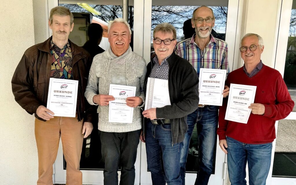 Bevor Werner Schach die Versammlung schloss, wurden noch fünf Sänger für ihre Treue zum Chorgesang mit Urkunden vom Oberschwäbischen Chorverband und den entsprechenden Nadeln für ihr langjähriges, aktives Mitsingen ausgezeichnet. Für 20 Jahre waren dies Siegfried Merk und Bernd Schmid, für 30 Jahre Bernhard Maucher und Alfred Ruf und gar für 40 Jahre gab es für Herbert Eisele die Auszeichnung des Schwäbischen Chorverbands. Dankbaren Applaus für die geehrten Sänger gab es durch die Versammlung.
