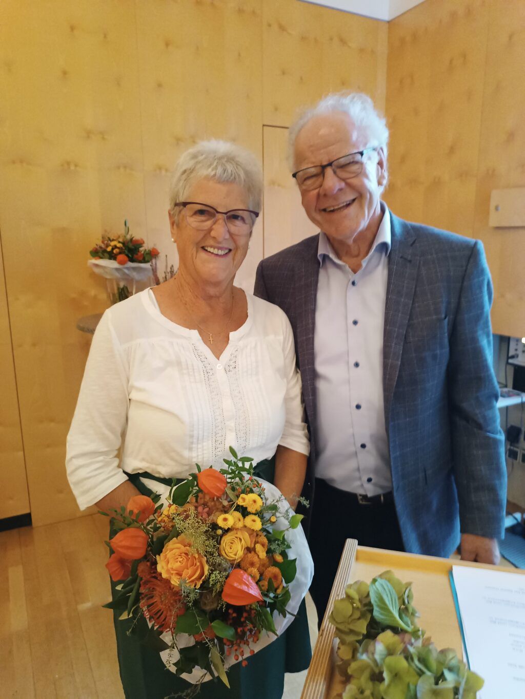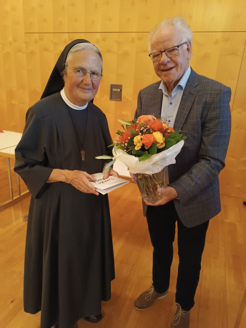 Besondere Dankeschön-Karten sowie Blumen/Wein vom Vorsitzenden bekamen Waltraud Hoch für elf Jahre höchst zuverlässige und kompetente Tätigkeit in der Anlauf- und Koordinationsstelle, Schwester Consulata vom Kloster Reute für sieben Jahre treue Dienste im Besuchsdienst, Klaus Dörrie für elf Jahre Einsatz im Fahr- und Begleitdienst. Stellvertretend für alle Ehrenamtlichen wurden Christel Teofanovic und Franz Lämmle für ihren vielfältigen und zupackenden Dienst in der Solidarischen Gemeinde geehrt. Lämmle revanchierte sich und gab mit sicherer Stimme das schwäbische Lied „D’r Gsangverei“ zum Besten. Mit schwäbischem Wurstsalat und Getränken klang der sehr harmonische Nachmittag aus.