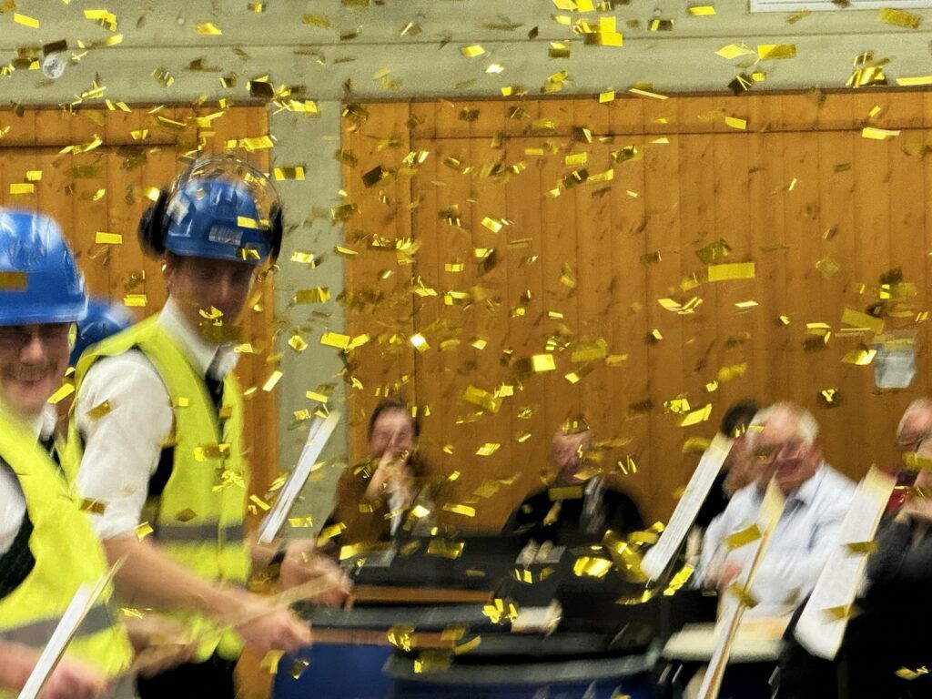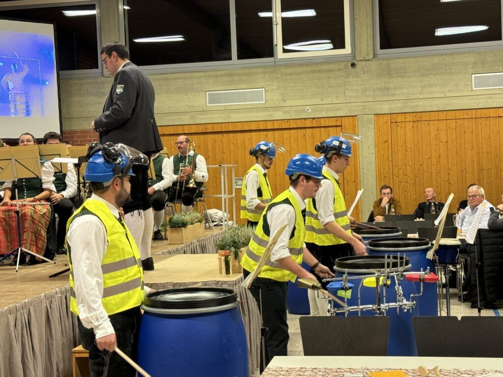 Auch die Schlagzeuger Fabian Lessig, Lukas Kessler, Markus Eisele, Simon Kibler und Maximilian Waibel, alle besonders passend kostümiert, hatten ihre Schlaginstrumente direkt vor der Bühne platziert und glänzten als Solisten mit „Drummersplash“. Den krönenden Schlusstakt nach der „Goldregen-Salve“ durfte dann OB Matthias Henne noch anbringen.