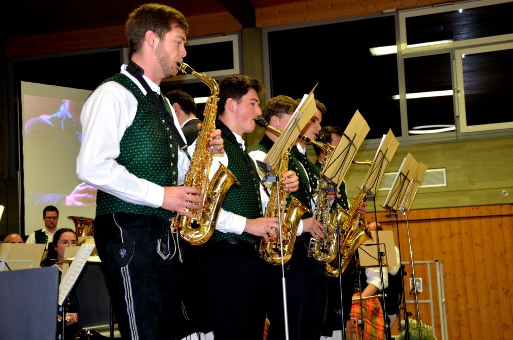 Riesigen Sonderbeifall ernteten zwei Solistengruppen. Ein junges Quintett.von Saxophonisten mit Emil Buck, Leo Krattenmacher, Markus Büchele, Markus Frick, Philipp Rottweiler brachte harmonisch swingend „Saxophon Jubilee“ von Harm Evers zu Gehör.