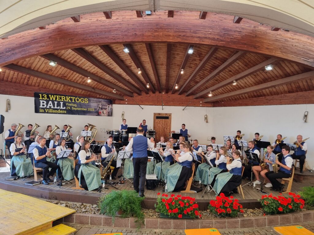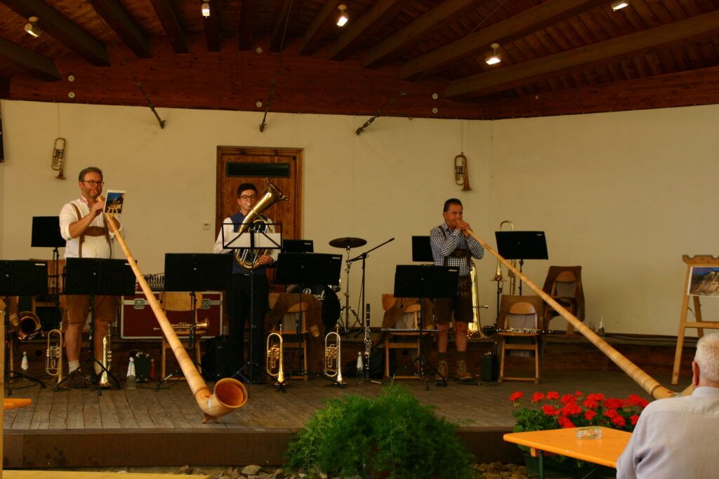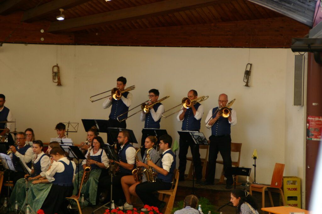 Der Empfang fand auf dem Gelände des Archeoparcs statt, der zu den bedeutendsten Ausgrabungsstätten im gesamten Alpenraum zählt und Einblicke in über 7.000 Jahre Siedlungsgeschichte gibt. Im Anschluss luden die Villanderer Musiker ihre Gäste zur Weinverkostung mit dem Chef der Kellerei Eisacktal, Peter Baumgartner, ein, der sehr viele Informationen zum Weinbau und den Rebsorten im Eisacktal unterhaltsam weitergab. Musikalisch ging es am Abend mit dem Start des zweitägigen „Musigfest“, bei dem mit „Rifflblech“ großes Blasmusikkino auf höchstem Niveau geboten wurde, weiter. Am Sonntagvormittag spielten dann die Gäste aus Reute-Gaisbeuren auf dem Festplatz auf und begeisterten die Zuhörer mit ihrem abwechslungsreichen und äußerst unterhaltsamen Programm.