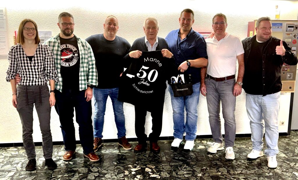 Den größten Applaus an diesem Abend erntete Manfred Staiger, als ihm Schiedsrichterkamerad Jürgen Frick ein Trikot mit der Aufschrift: „50 Jahre Schiedsrichter“ überreichte und auch erwähnte, dass der SV Haisterkirch im Bezirksverband (WFV) und gemessen an der Größe des Vereins mit zehn gemeldeten aktiven Schiedsrichtern zu den Top-Vereinen zähle.