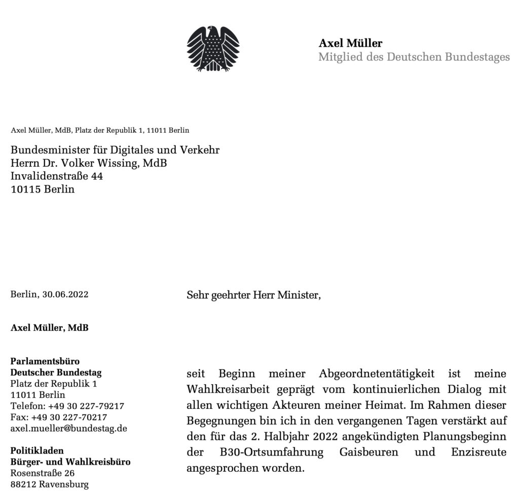 Aus einem Brief des CDU-Bundestagsabgeordneten Axel Müller an Verkehrsminister Wissing vom 30. 6. 2022. Den Brief in voller Länge finden Sie hier unter „Downloads“. Der damals interne Brief ist mittlerweile vom Verfasser zur Veröffentlichung freigegeben. Alle aus der Region stammenden Abgeordneten haben sich im Laufe der vielen Jahre mehr oder weniger für eine Sanierung der verkehrlichen Situation in Gaisbeuren eingesetzt, so zum Beispiel auch der SPD-Abgeordnete Martin Gerster und weitere Abgeordnete aus der Raumschaft.