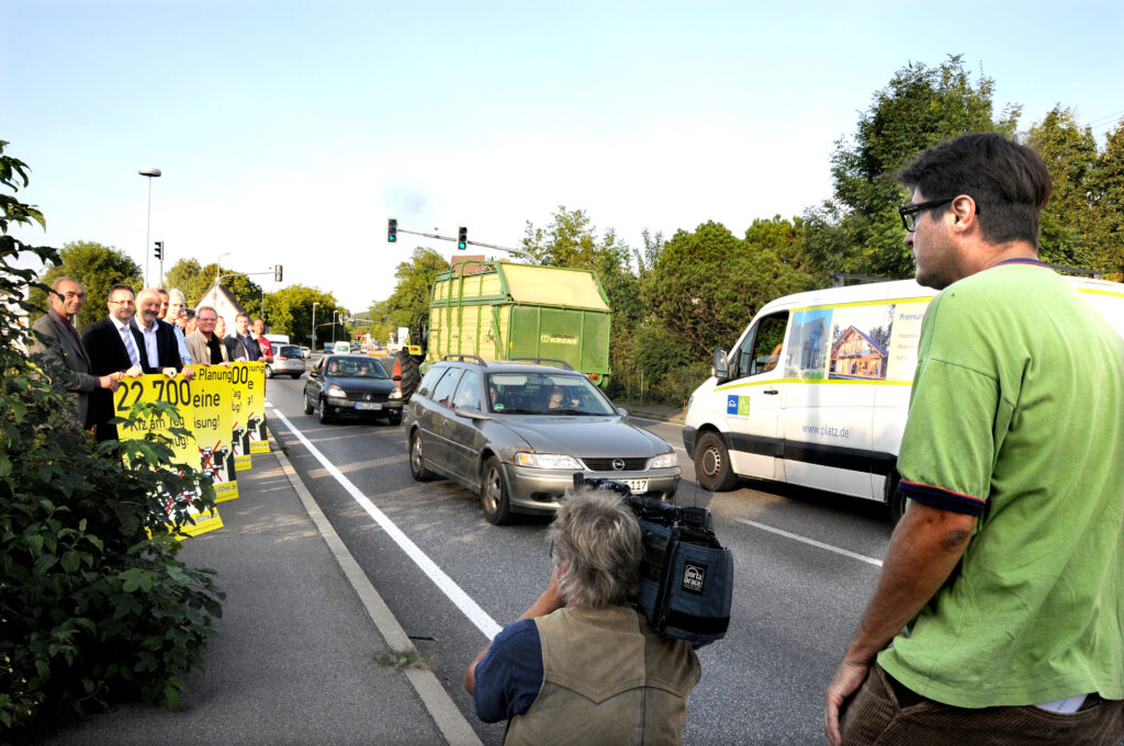 Seit vielen Jahren protestieren Anlieger und Regionalpolitiker gegen die Überlastung der Anwohnerschaft im Nadelöhr Gaisbeuren. Unser Bild zeigt eine Kundgebung der Stadt Bad Waldsee zusammen mit dem Regionalverband Bodensee-Oberschwaben im September 2012. Die Stadt war damals durch den Ersten Beigeordneten Thomas Manz vertreten. Foto: Brigitte Göppel
