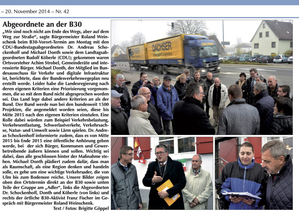 Am 17. April 2014 waren die CDU-Bundestagsabgeordneten Andreas Schockenhoff und Michael Donth sowie der Landtagsabgeordnete Rudolf Köberle vor Ort, um sich mit der Problematik der Ortsdurchfahrt zu befassen. Im vorstehenden Amtsblatt-Ausriss sieht man auf dem kleinen Bild rechts unten den örtlichen B30-Aktivisten Franz Fischer im Gespräch mit Bürgermeister Roland Weinschenk. Unser Ausriss stammt aus der Amtsblattausgabe vom 20. November 2014. Die Fotos hat Brigitte Göppel (Stadt Bad Waldsee) gemacht.