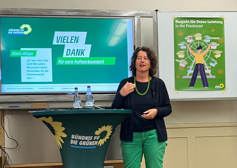 Im Anschluss sprach Petra Krebs, die Landtagsabgeordnete der Grünen, in einem Grußwort den anwesenden aktuellen und ehemaligen MandatsträgerInnen und Mitgliedern ihren Dank für ihr Engagement für das demokratische Gemeinwesen und grüne Kernanliegen aus.