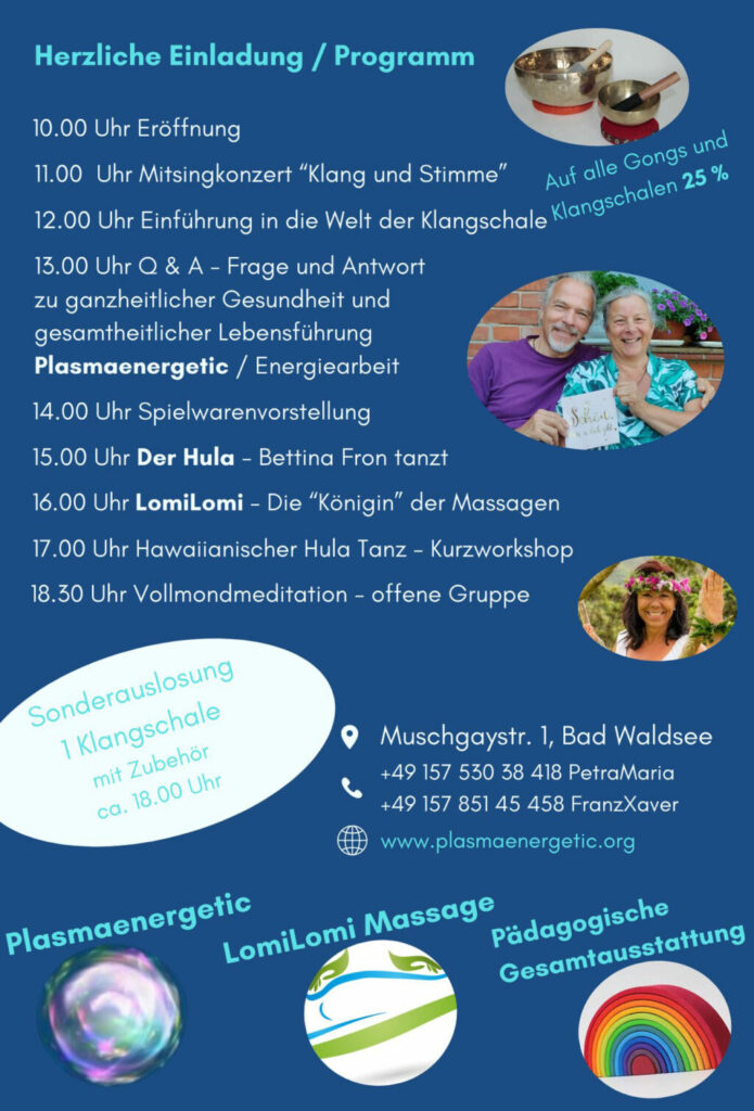 Bad Waldsee (dbsz) – „Schwingung, Berührung, Klang und Spiel“ – das sind Kernbegriffe im Angebot von Franz Xaver Ott und PetraMaria Allgaier, die in der Muschgaystraße 1 – bei Geisinger im 1. Stock – eine Beratung zur ganzheitlichen Gesundheit eröffnet haben (Termine nach Vereinbarung). Am Sonntag, 20. Oktober, ist Tag der offenen Tür (ab 10.00 Uhr). Nachstehend der Ablauf des Tages: