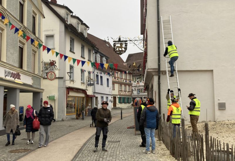 Bad Waldsee – ‘s goht dagega! Ein untrügliches Zeichen, dass die Fasnet die Kurve kriegt, ist das Klettern der Jungelfer. Heute morgen (18.1.) war es wieder so weit: Die fleißigen Fasnet-Aktivisten stiegen auf Leitern und brachten die bunten Wimpel an. „Erre“ Linder, der viel Narrenblut in seinen Adern hat, kam zufällig des Weges und schaute zu. Ein Reporter aber ist immer im Dienst und so zückte er seine Kamera. AHA.