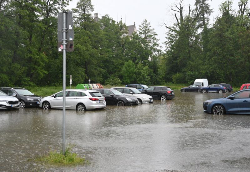 Bad Waldsee – Der endlos niederprasselnde Regen bescherte Bad Waldsee ein paar neue Seen. Der untere Teil des Bleicheparkplatzes ist fast vollständig überflutet. Wer sein Auto nicht rechtzeitig in Sicherheit brachte, ist gut beraten, sich hohe Gummistiefel anzuziehen, um sein Gefährt noch trockenen Fußes zu erreichen. Bürgermeisterin Ludy und Feuerwehrkommandant Burkhardt sind seit dem frühen Morgen im Einsatz und informieren sich vor Ort von der aktuellen Situation. Unser Reporter war he…