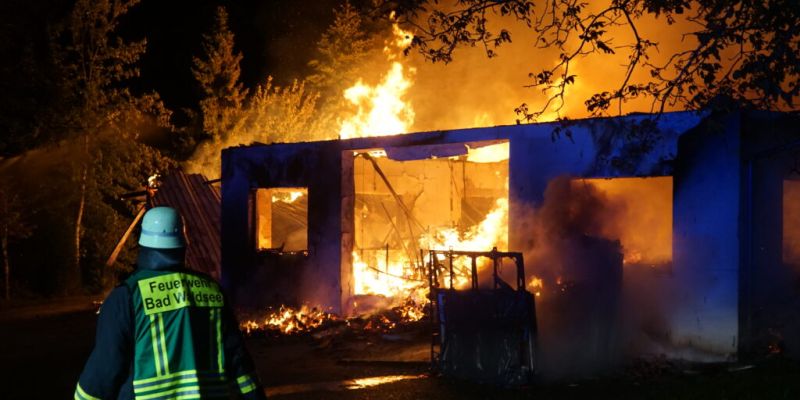 Rötenbach (rei) – In Rötenbach (Gemeinde Wolfegg) ist eine Schreinerei abgebrannt. Wie uns das Südwestdeutsche Mediennetzwerk GmbH um 5.29 Uhr mitteilte, waren rund 80 Einsatzkräfte von Feuerwehr und Rettungsdienst vor Ort. Es wurde eine Wasserwand errichtet, um ein Übergreifen des Brandes auf ein benachbartes Wohnhaus zu verhindern. Der Schaden beläuft sich auf geschätzt 600.000 €, teilte uns die Polizei auf Anfrage mit. Verletzt wurde niemand. Im Einsatz waren Wehrleute aus Wolfegg, Bad Walds…