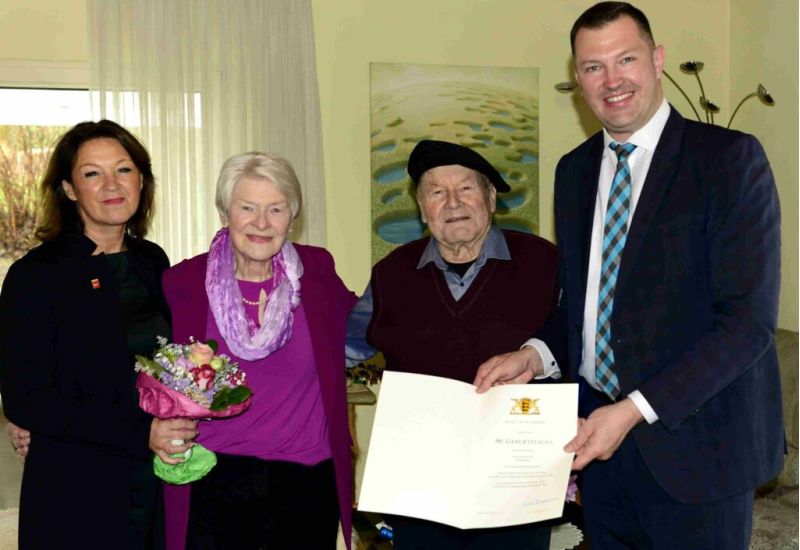 Bad Waldsee – Zum 90. Geburtstag gratulierten Oberbürgermeister Matthias Henne und Bürgermeisterin Monika Ludy der Jubilarin Gertrud Auer vergangenen Montag (18.3.) ganz herzlich. Sie überreichten einen Geschenkkorb, gefüllt mit regionalen Produkten, sowie die Urkunde des Ministerpräsidenten Winfried Kretschmann.