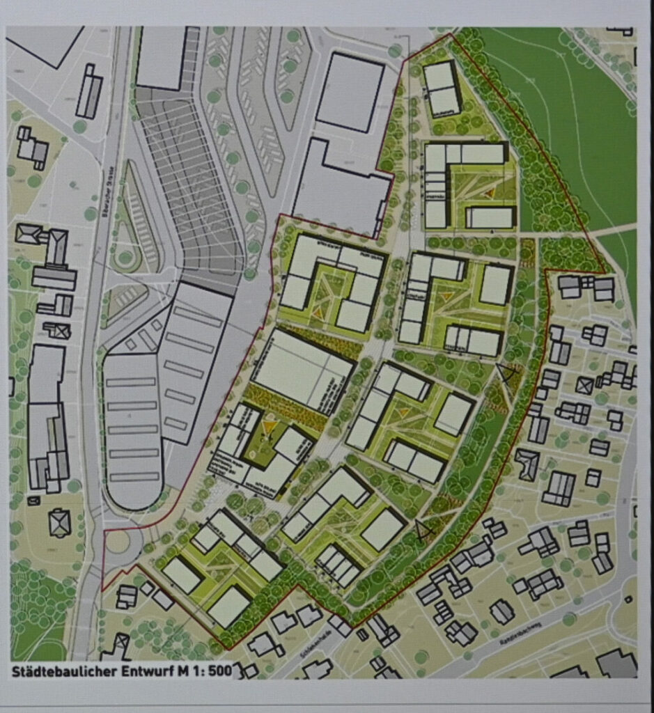 Bürgermeisterin Monika Ludy ging in ihrer Vorstellung des Projektes auf den dringend benötigten Wohnraum ein, auch barrierefreie Wohnungen würden hier entstehen. Zirka 10 Prozent der Bebauung seien als Gewerbeflächen vorgesehen. Gleich im ersten Bauabschnitt soll ein fünfgruppiger Kindergarten entstehen. Das städtebaulich spannende Projekt, bei dem viele vorher versiegelte Flächen entsiegelt würden, biete über Jahre die Chance der Weiterentwicklung.