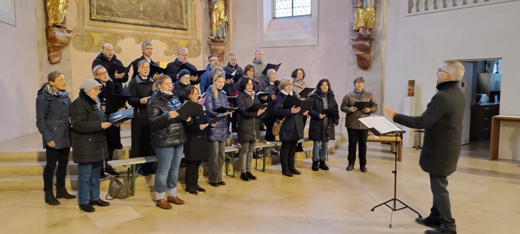 In den Fürbitten ging es Kathrin Bohnenberger neben dem Gedenken der zahllosen Toten und der Hoffnung auf Frieden hauptsächlich auch um eine Versöhnung unter den Menschen. Der „Chor Reutissimo“ unter dem Dirigat von Joachim Zitzmann umrahmte diesen Wortgottesdienst mit erhebenden Gesängen. Das italienische Gebet „Signore Delle Cime“ war neu im Repertoire des Chors und wurde sehr inbrünstig vorgetragen. Verena Westhäußer begleitete an der Orgel Lieder aus dem Gotteslob.