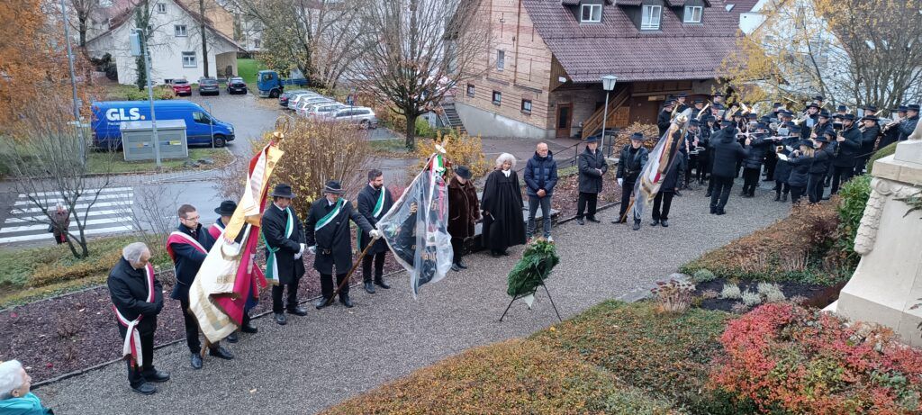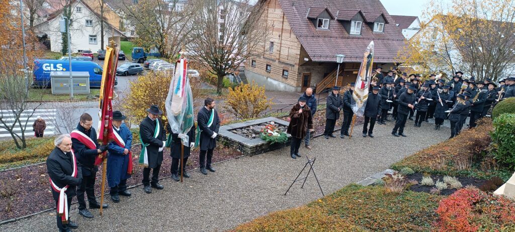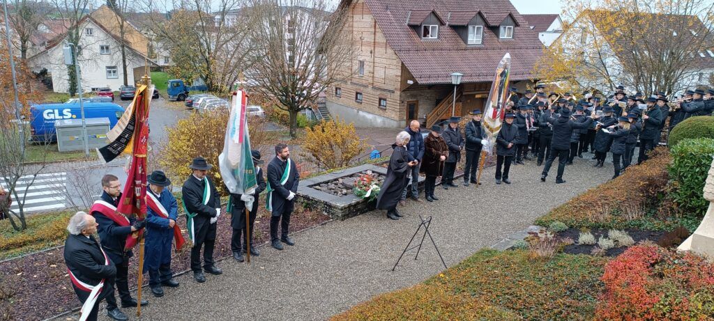 Anschließend versammelte sich die Gemeinde zusammen mit der Musikkapelle und den Fahnenabordnungen der Vereine am Kriegerdenkmal. Nach Gebeten der Pfarrerin erinnerte Angelika Brauchle in Vertretung des erkrankten Ortsvorstehers Achim Strobel an die Millionen von Menschen, welche durch Kriege starben, aber auch an diejenigen, welche gerade heute Krieg und Gewalt ausgesetzt sind: „Letztes Jahr waren wir entsetzt über die Massaker im Ukraine-Krieg und hegten die Hoffnung, dass Russland doch zur Vernunft kommt. Seit dem 7. Oktober herrschen in Nahost barbarische Auseinandersetzungen. Friedlich feiernde junge Menschen, Alte und Kinder werden bestialisch verschleppt und ermordet“.