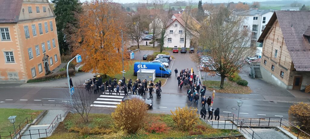 Reute-Gaisbeuren – Unter großer Anteilnahme der Vereine und auch der Bevölkerung wurde in Reute der Volkstrauertag begangen. Vom Dorfplatz aus folgten die Vereine mit ihren Fahnenabordnungen sowie Mitglieder des Ortschaftsrats den Klängen der Musikkapelle zur Pfarr- und Wallfahrtskirche St. Peter und Paul. Hier feierten Pfarrerin Birgit Oehme und die neue Gemeindereferentin Kathrin Bohnenberger einen ökumenischen Gottesdienst. Der Liederkranz Reute „Reutissimo“ umrahmte mit seinem Gesang diese Gedenkfeier.