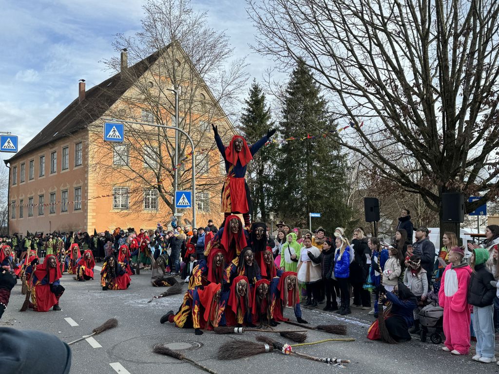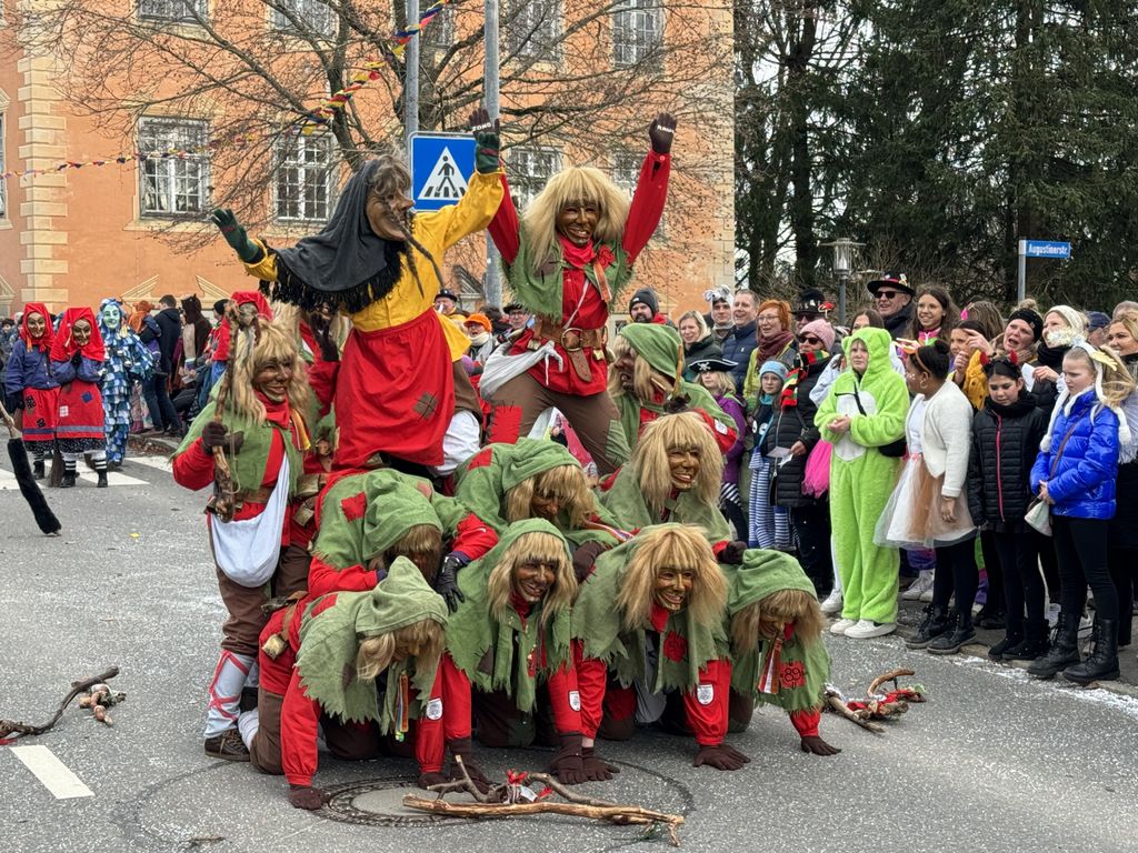 Einzelne Hexengruppen gefielen beim Pyramidenbau, zeigten sich fit bei akrobatischen Sprüngen. Stets brandete Applaus auf. Riesigen, spontanen Beifall ernteten vor allem die einheimischen, farbenprächtigen Narrengruppen, zu denen auch viele Närrinnen und Narren aus Gaisbeuren gehörten. Ganz aktuell versuchten sie, der Gesundheitspolitik auf die Sprünge zu helfen.