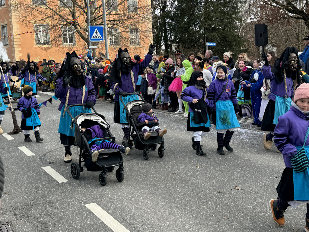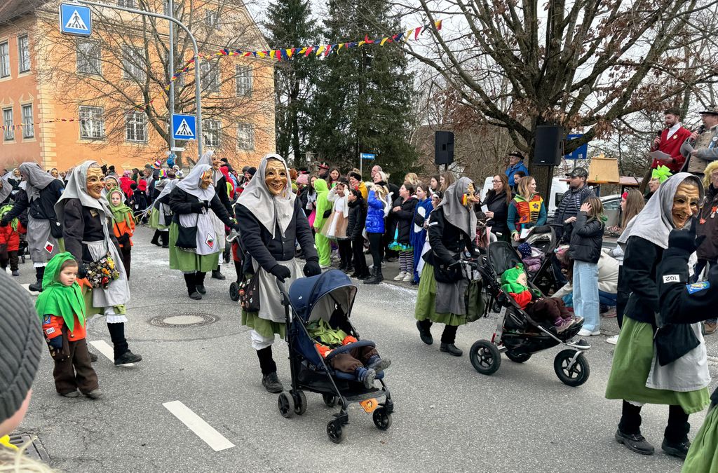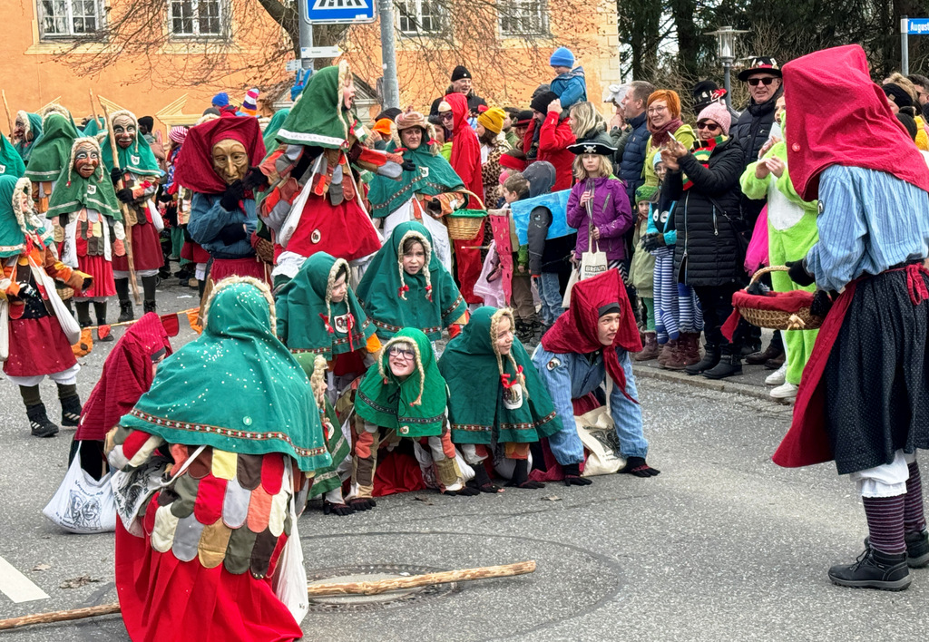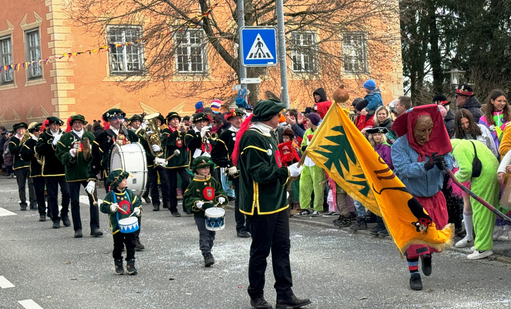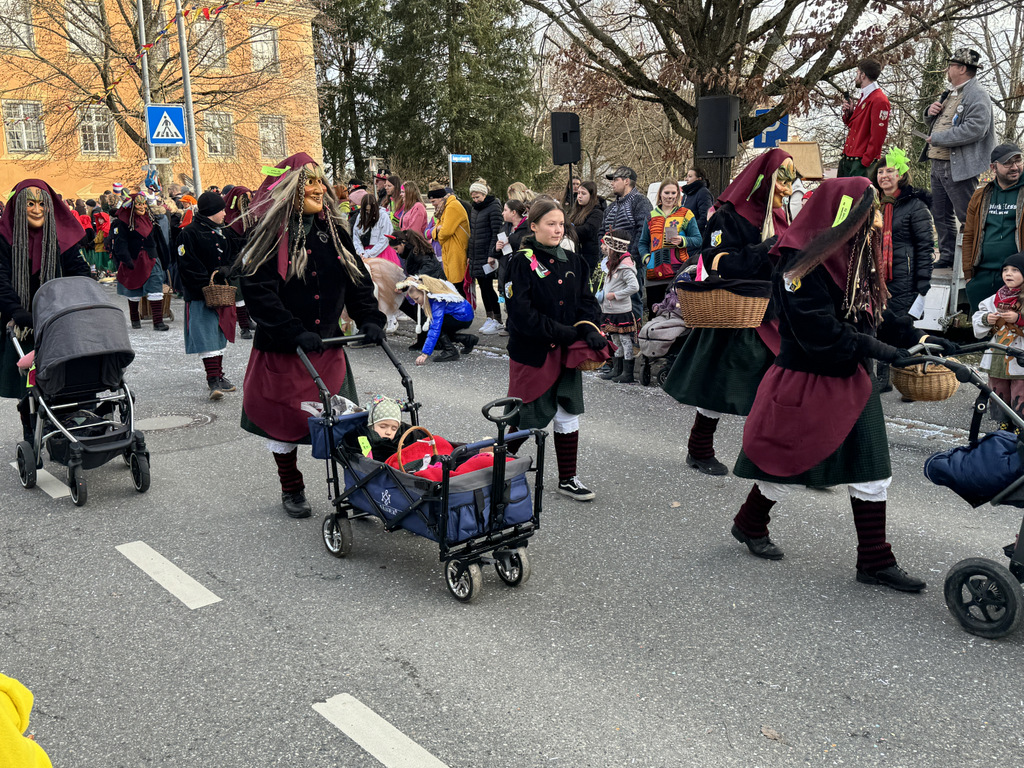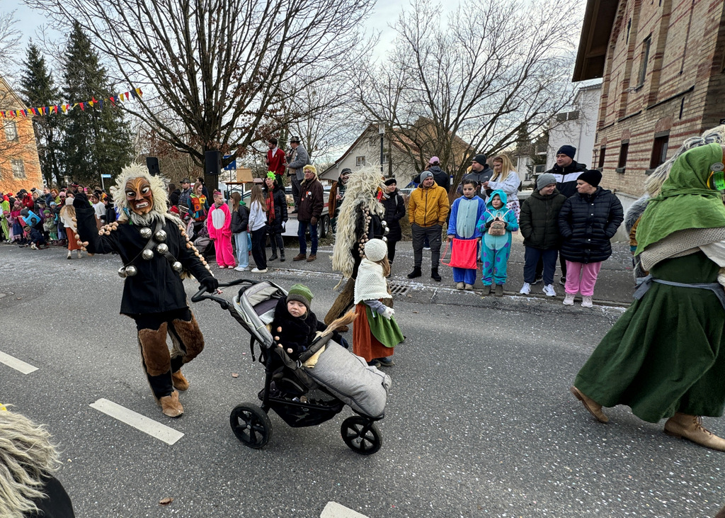 Viele Kleinkinder, manche davon im Kinderwagen, durften das närrische Spektakel hautnah miterleben und hatten offensichtlich Spaß dabei. An Nachwuchs mangelt es den Narrengilden und Narrenzünften offensichtlich nicht.