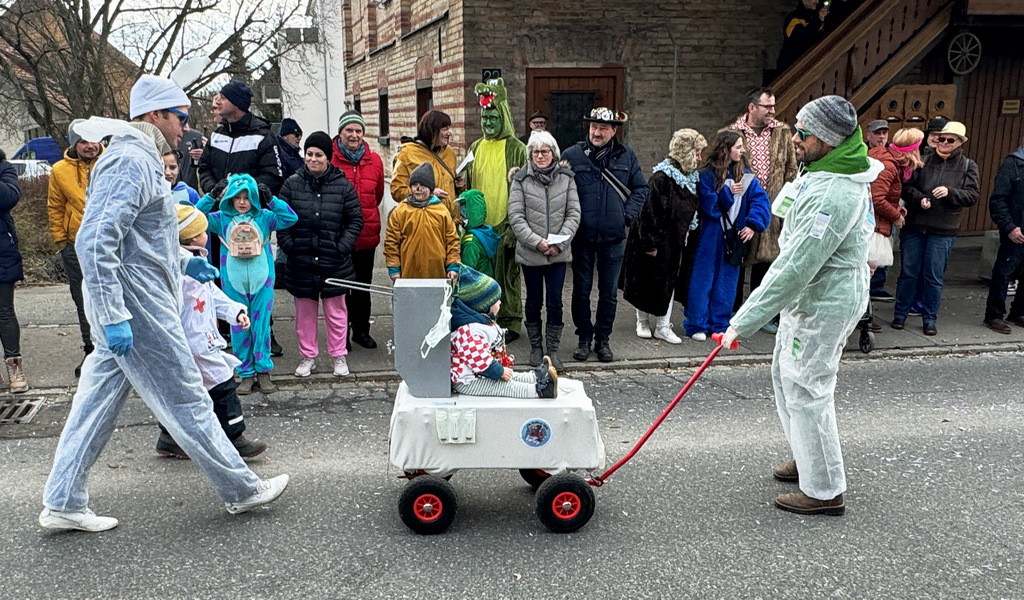 Ansager der Narrengilde, dieses Mal auf einem Wagen in der Nähe des ehemaligen Pfarrhauses platziert, stellten die einzelnen Umzugsgruppen vor, feuerten diese mit ihren Narrensprüchen an und verstanden es bestens, die närrische Stimmung von einem Hoch zum anderen anzuheben.