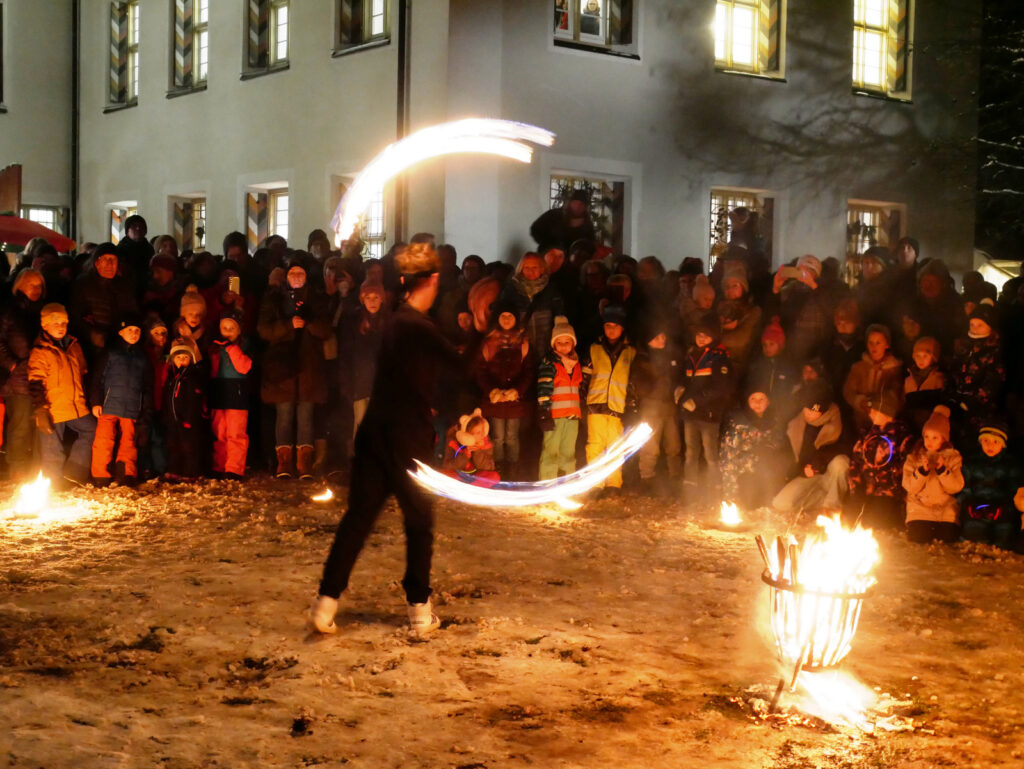 Mehrere Hundert Zuschauer waren geblieben oder auch extra gekommen, um ab 20.00 Uhr die Feuershow des Feuerkünstlers Dan Lang aus Haisterkirch und der Feuerkünstlerin von „Matri-Feuertanz“ aus Isny miterleben und bestaunen zu können .Der Applaus war recht groß. Es war ein bezaubernder, feuriger Abschluss der wiederum gelungenen Großveranstaltung „Lichtmomente“.