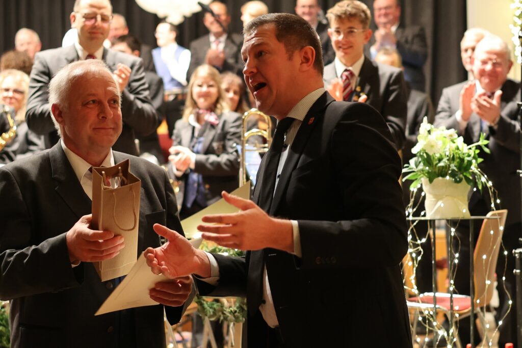 Bad Waldsee – Die Stadtkapelle Bad Waldsee setzte mit ihrem Jahreskonzert am Samstag (30.11.) ein eindrucksvolles musikalisches Zeichen. In der nicht ganz ausverkauften Stadthalle bewiesen die Musikerinnen und Musiker unter der Leitung von Joachim Weiss einmal mehr ihre herausragende Qualität. Ein besonderer Moment des Abends war die feierliche Ernennung von Joachim Weiss zum Stadtmusikdirektor durch Oberbürgermeister Matthias Henne. In seiner Ansprache würdigte Henne die Stadtkapelle für ihren „Dienst an der Gemeinschaft“, den sie seit fast 200 Jahren leistet. Ein weiterer Höhepunkt war die Ehrung von Rudi Birk für beeindruckende 77 Jahre aktive Mitgliedschaft.