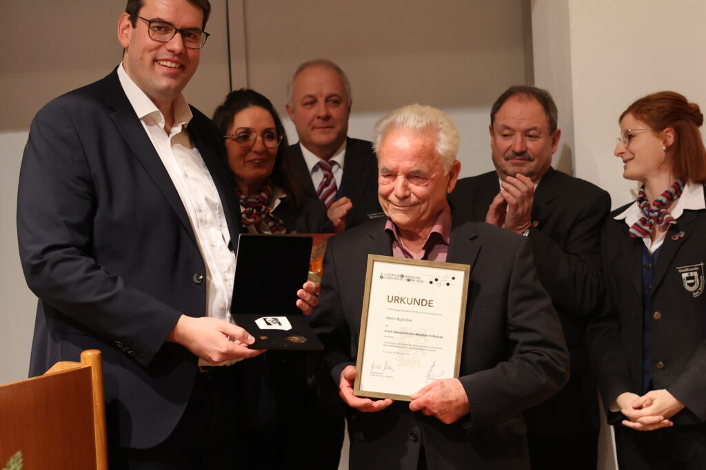 Rudi Birk wurde mit der Erich-Ganzenmüller-Medaille ausgezeichnet. Klaus Wachter ließ in seiner Laudatio die Stationen von Birks musikalischem Lebensweg Revue passieren und erinnerte an seine unvergleichliche Leidenschaft für die Musik. Mit neun Jahren hatte Rudi Birk mit dem Musizieren begonnen.