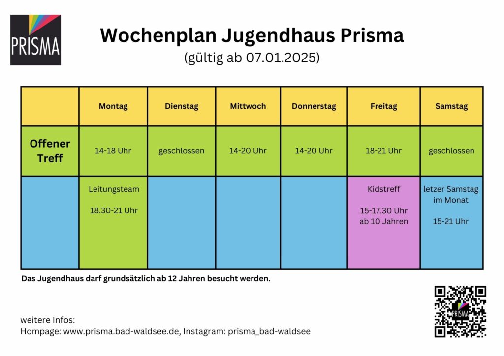 Aufgrund des personellen Engpasses im Jugendhaus können der Jungs- und Mädchentreff nicht wie gewohnt stattfinden. Stattdessen plant das Prisma-Team feste Zeiten für Kinder und Jugendliche ab 10 Jahren jeden Freitag von 15:00 bis 17:30 Uhr.