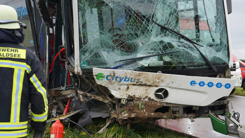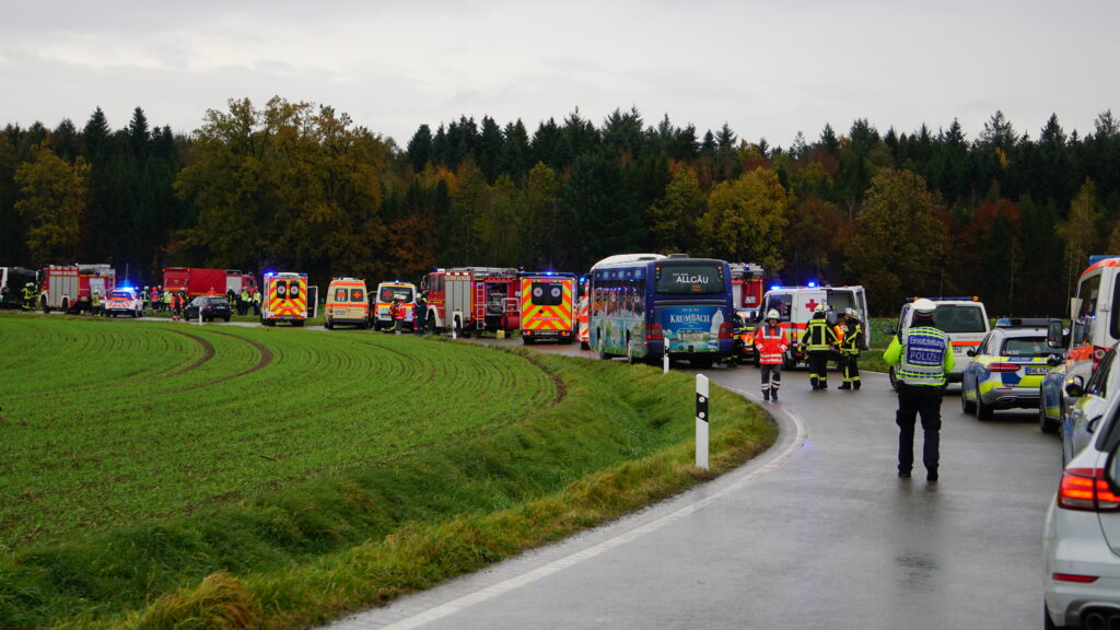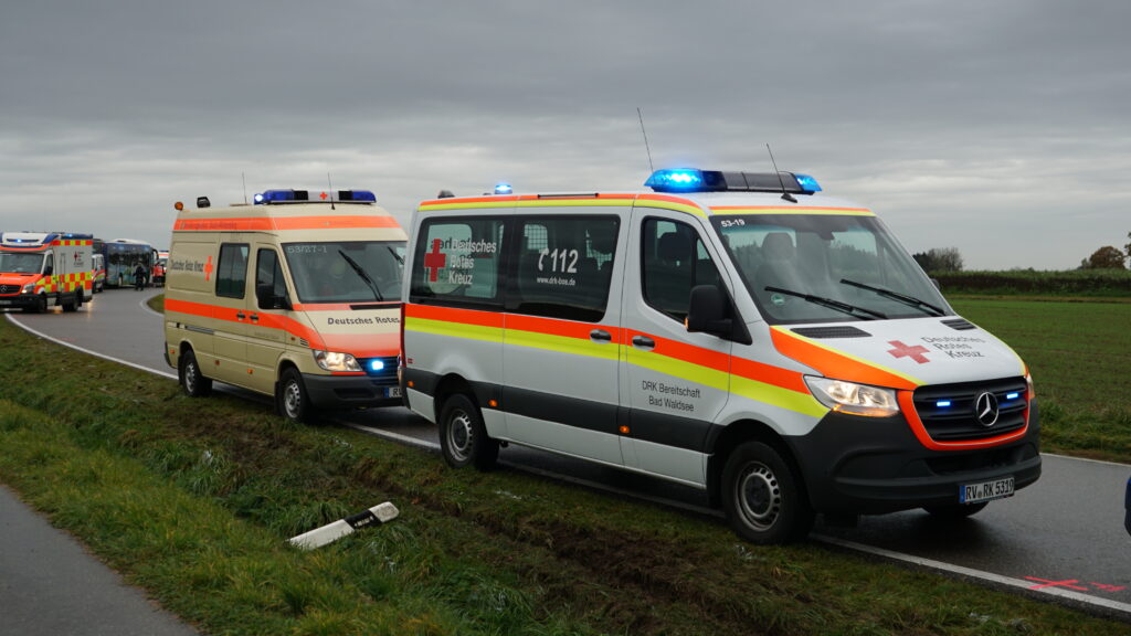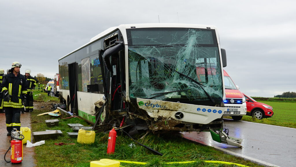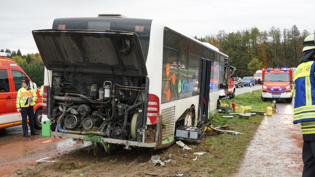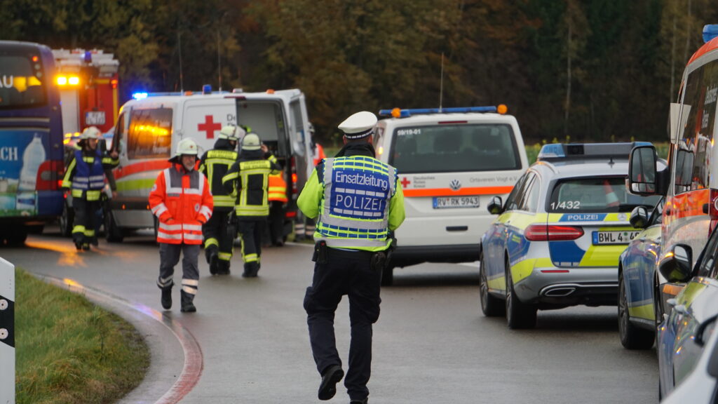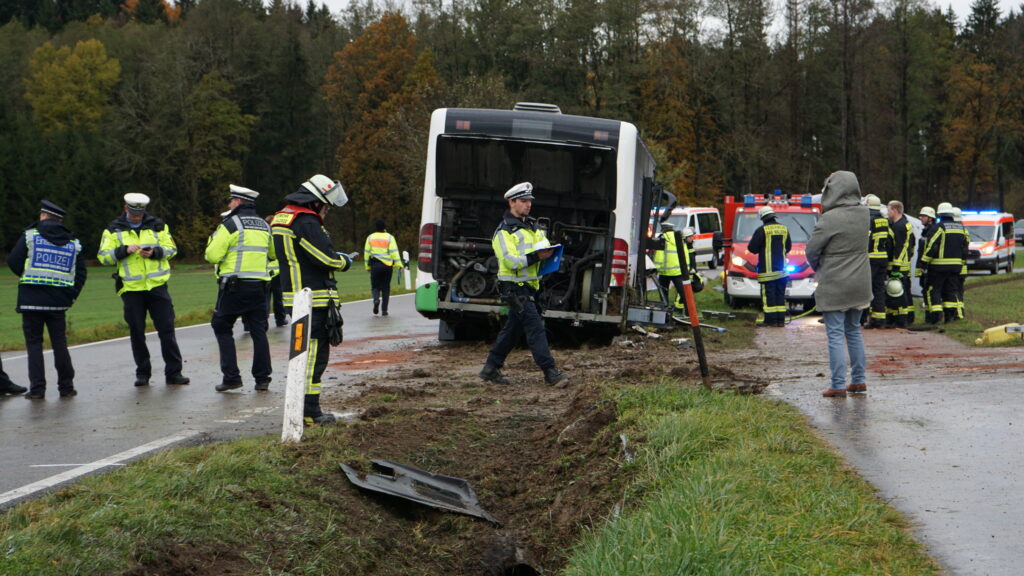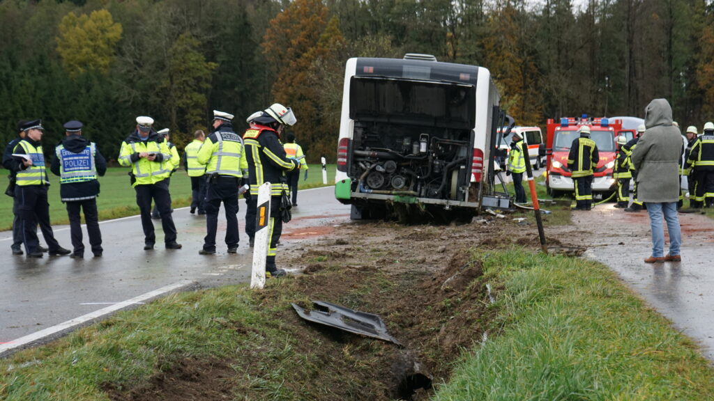 Bad Waldsee (ots) – Drei schwer und sieben leichtverletzte Personen hat ser Verkehrsunfall am Montag (13.11.) gegen 12.30 Uhr auf der K 7943 zwischen Steinenberg und Lenatweiler gefordert. Ersten Erkenntnissen der Polizei zufolge war der Schulbus, der in Richtung Michelwinnaden unterwegs war, mutmaßlich aufgrund eines Fahrfehlers des 52-jährigen Lenkers nach rechts von der Fahrbahn abgekommen. Dort gelangte der Omnibus in den Abwassergraben und schrammte im Anschluss über eine Querstraße, wodurch die Front des Busses erheblich beschädigt wurde.