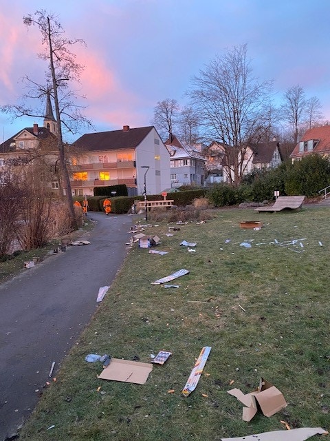 Am 2. Januar mussten sechs weitere Mitarbeitende erneut ausrücken, um in weiteren 8,5 Stunden die Überreste einer völlig ausufernden Silvesternacht zu beseitigen. Besonders auf der Bleiche war das Bild niederschmetternd. Was bleibt, ist eine Frage: Muss das sein?