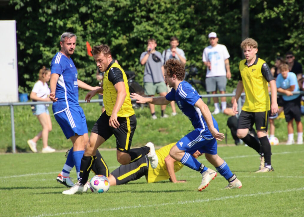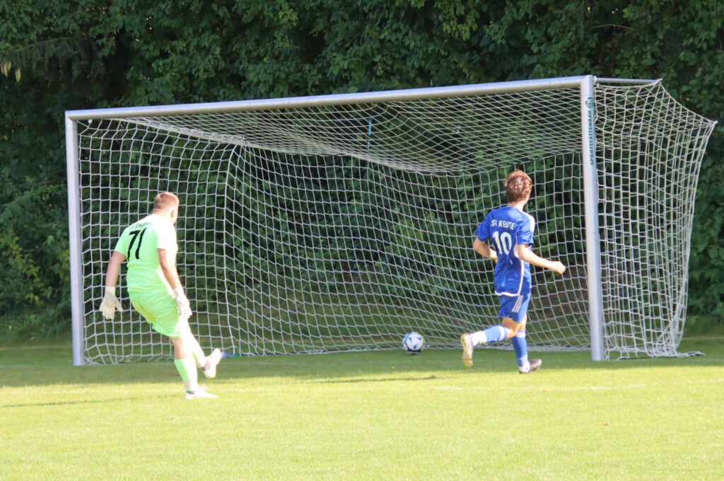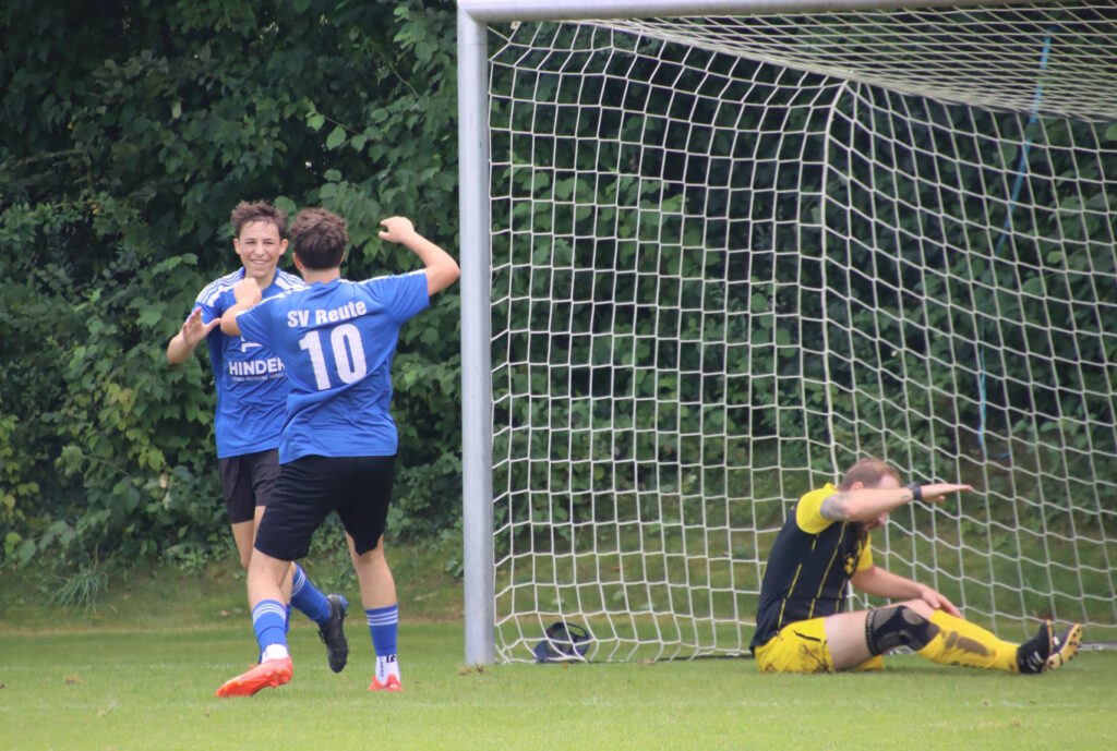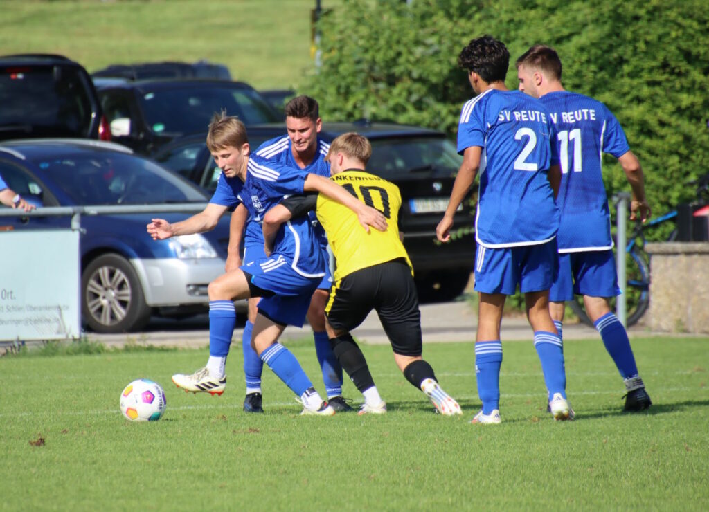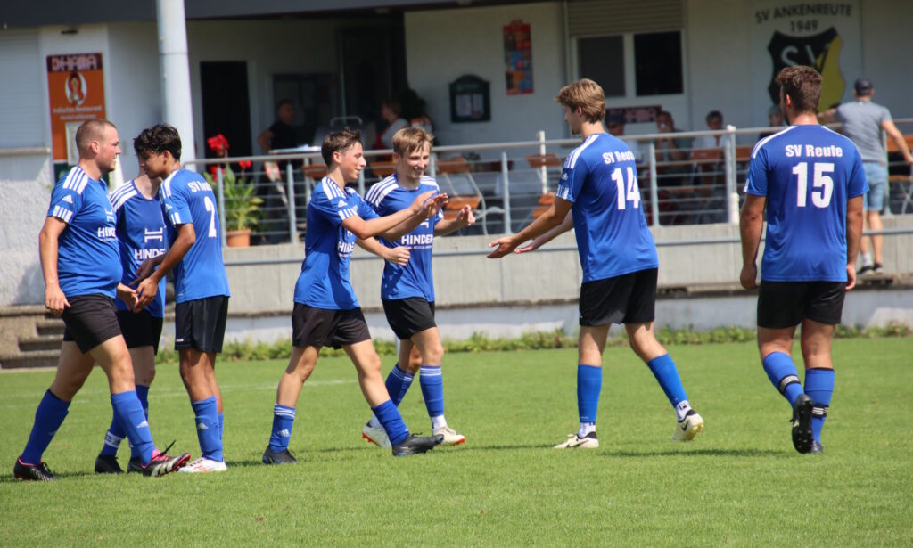 Bei hohen Temperaturen legten die Gäste los wie die Feuerwehr und führten nach fünf Minuten bereits mit 3:0-Toren. Tim Geßler eröffnete den Torreigen in der ersten Spielminute mit seinem ersten Treffer im Aktivenbereich überhaupt und was für ein schöner – gekonnt schlenzte er das Ding aus 20 Meter rechts ins Tor. Wenig später lief Niklas Maucher rechts durch, seine Hereingabe bugsierte Julian Neyer zum 0:2 ins Tor. Identische Spielsituation nur eine Minute später, dieses Mal traf erneut Tim Geßler nach der Hereingabe von Niklas Maucher und schraubte den Spielstand auf 0:3. Doch dann ließ man die Gastgeber mehr und mehr ins Spiel kommen und kassierte nach einer Viertelstunde prompt den Anschlusstreffer. Es entwickelte sich nun ein intensives Spiel und Tim Geßler verpasste nach einer halben Stunde den Hattrick, als er nach einem Solo den Ball hauchdünn am Ankenreuter Tor vorbeisetzte. Fünf Minuten später gelang den Hausherren nach einem Eckball das 2:3. Doch Reute schlug postwendend zurück, als Leon Schirmer eine Vorlage von Tim Geßler zum vierten Reutener Treffer versenkte. Mit diesem Spielstand ging es in die wohlverdiente Halbzeitpause.